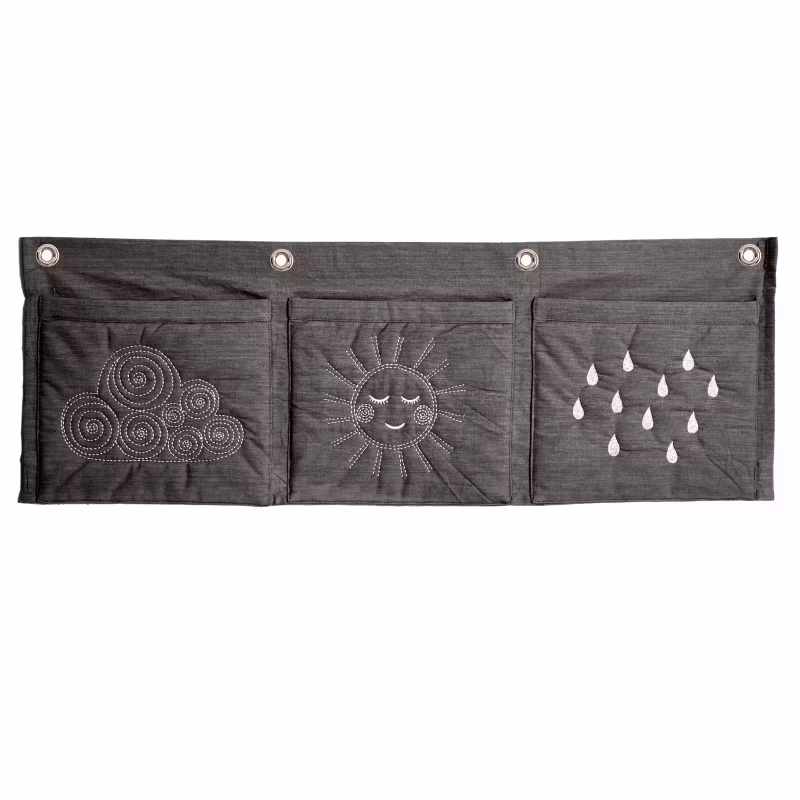 En praktisk horisontell väggförvaring i ekologiskt tyg med tre fickor som har broderad dekor med väder tema.