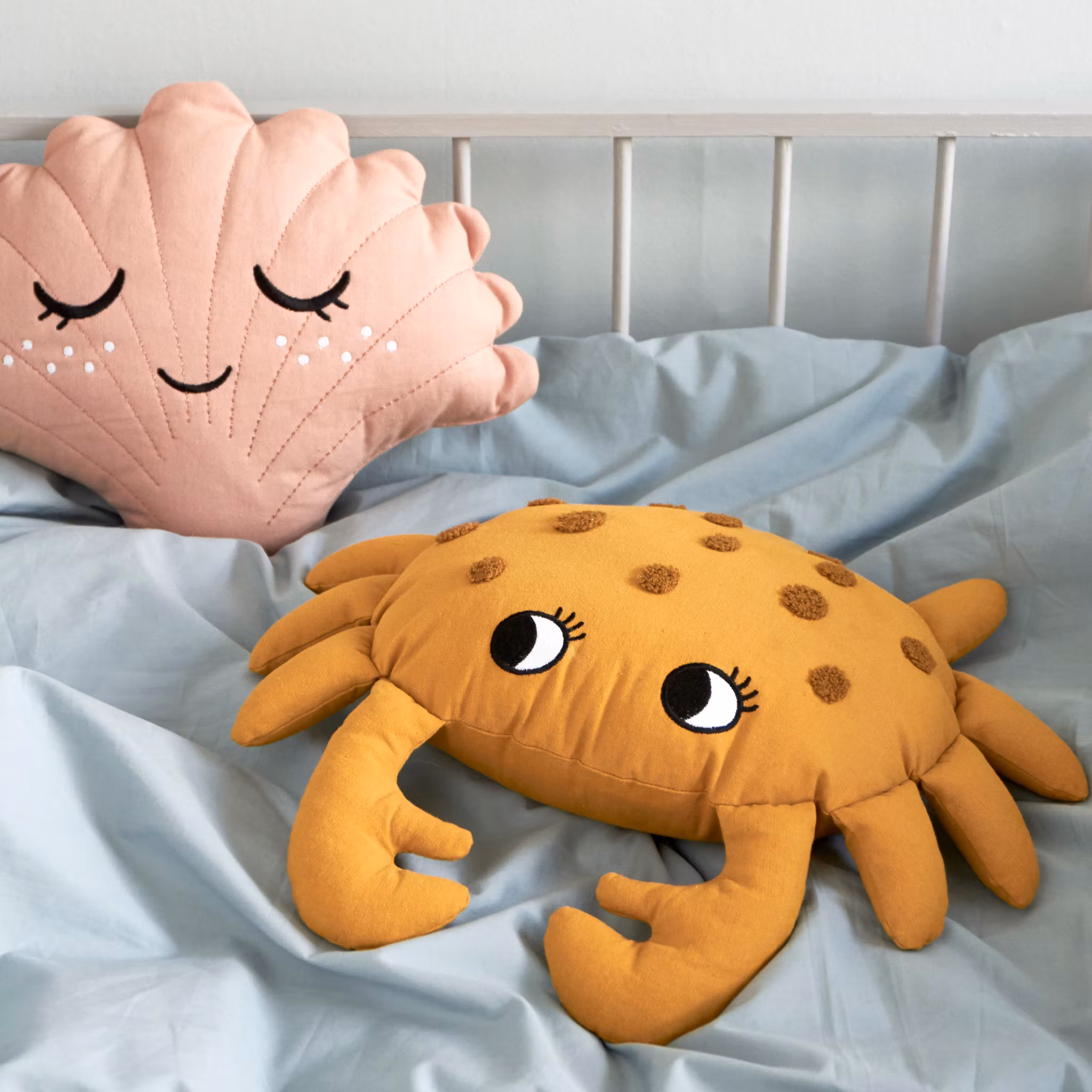 En kul ekologisk kudde i form av en vänlig ockra-gul krabba med åtta ben, två klor och broderad design.
