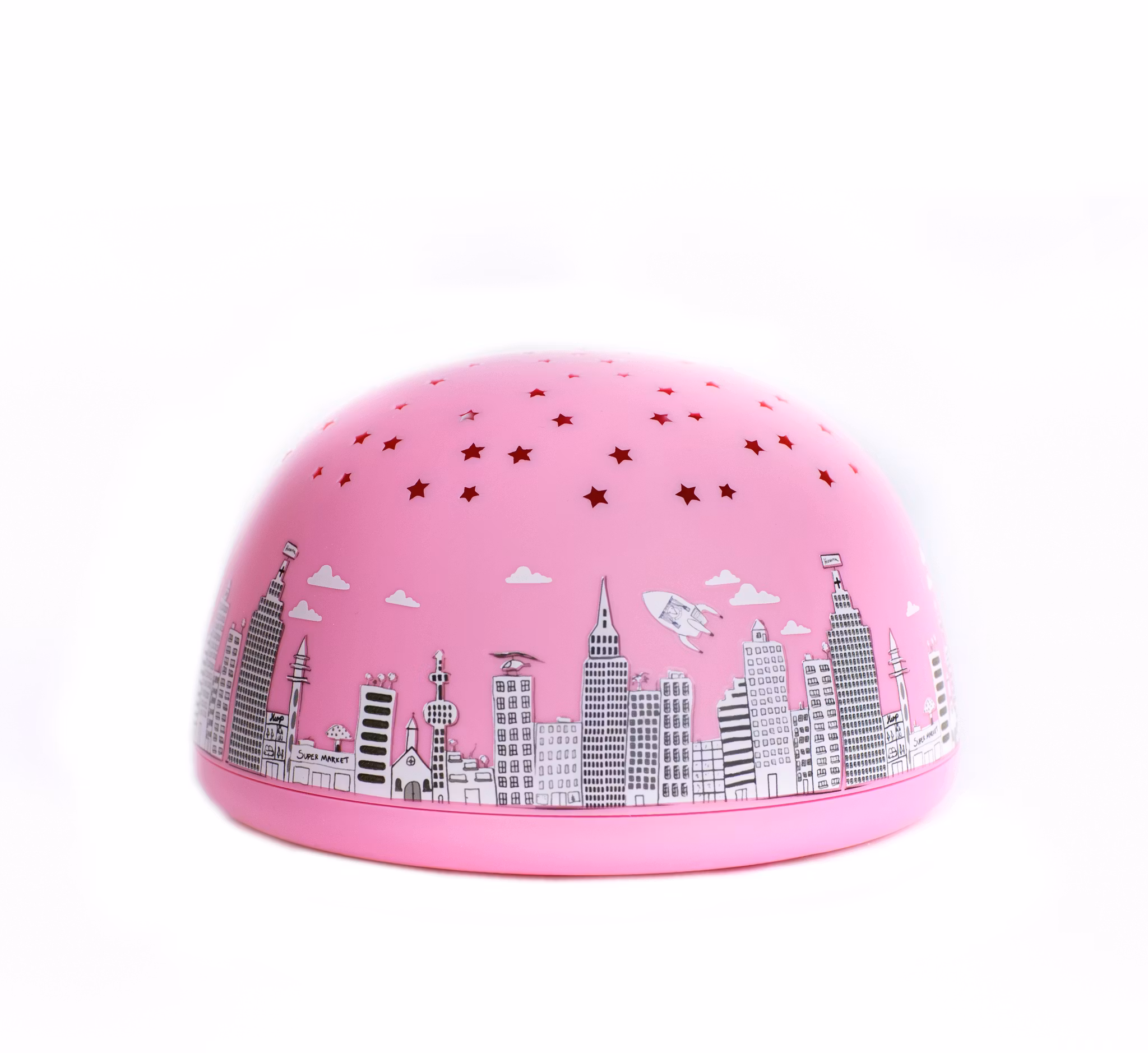En härlig stjärnprojektor/nattlampa/speldosa i rosa som ger ett behagligt stjärnspel i taket och på väggar.