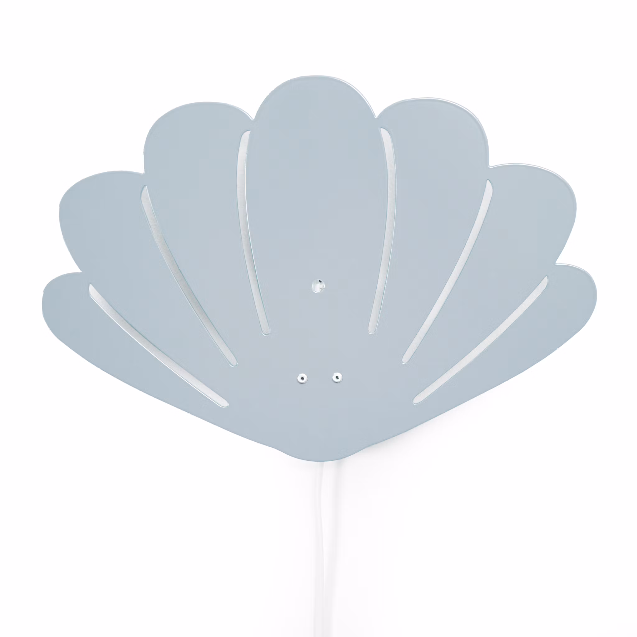 En kul och snygg vägglampa formad som en ljusblå snäcka där siluetten och de utskurna linjerna lyses upp när lampan tänds.