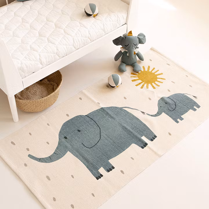 En härlig matta för barnrummet tillverkad av 100% bomull, (Oeko-Tex standard 100). Mattan är handvävd med ett fint elefantmotiv. Mattan kan tvättas i 30°. Hängtorkas och undvik direkt solljus.