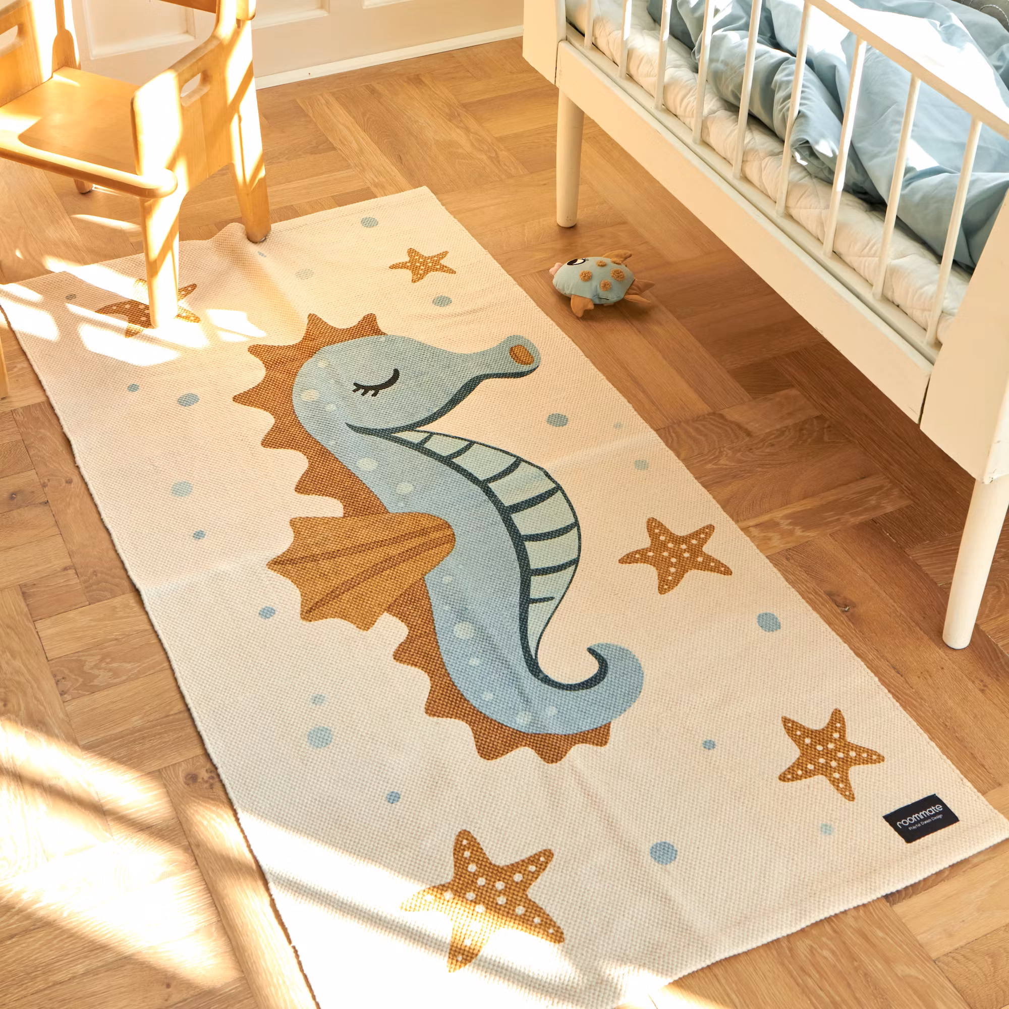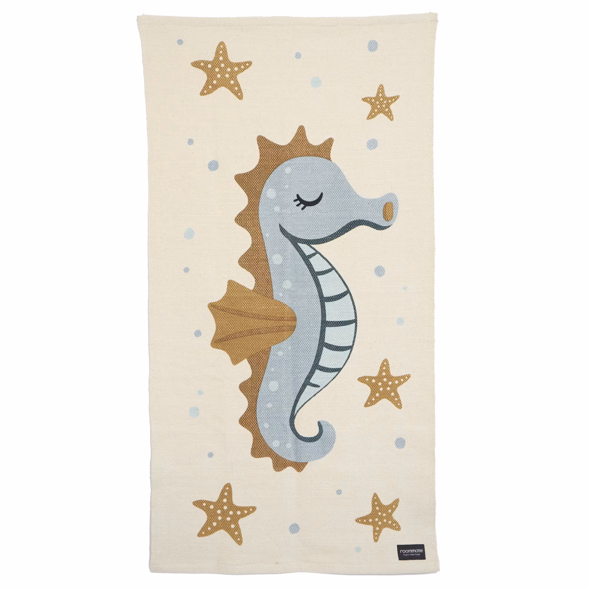 En snygg handvävd matta för till exempel barnrummet, med ett vackert motiv på en gräddvit botten där en söt ljusblå sjöhäst är omgiven av några snygga sjöstjärnor och ljusblåa bubblor. Tillverkad av 100% bomull och Oeko-Tex certifierad.