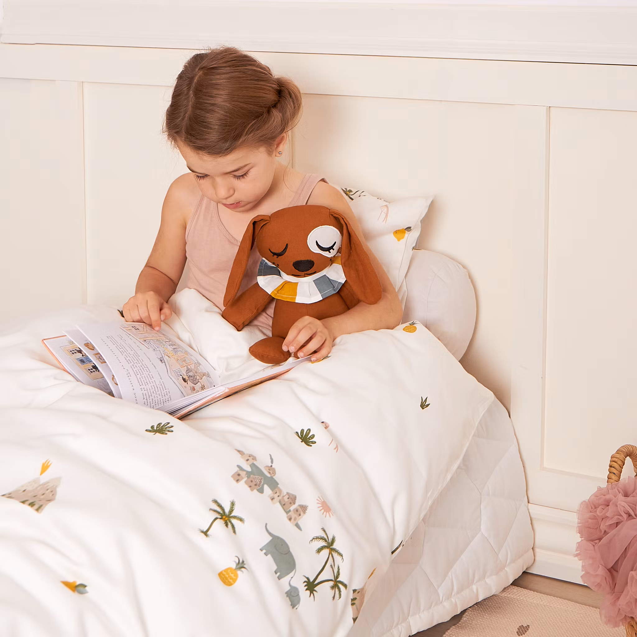 Sängkläder tillverkade av ekologisk bomull med tropiskt motiv.