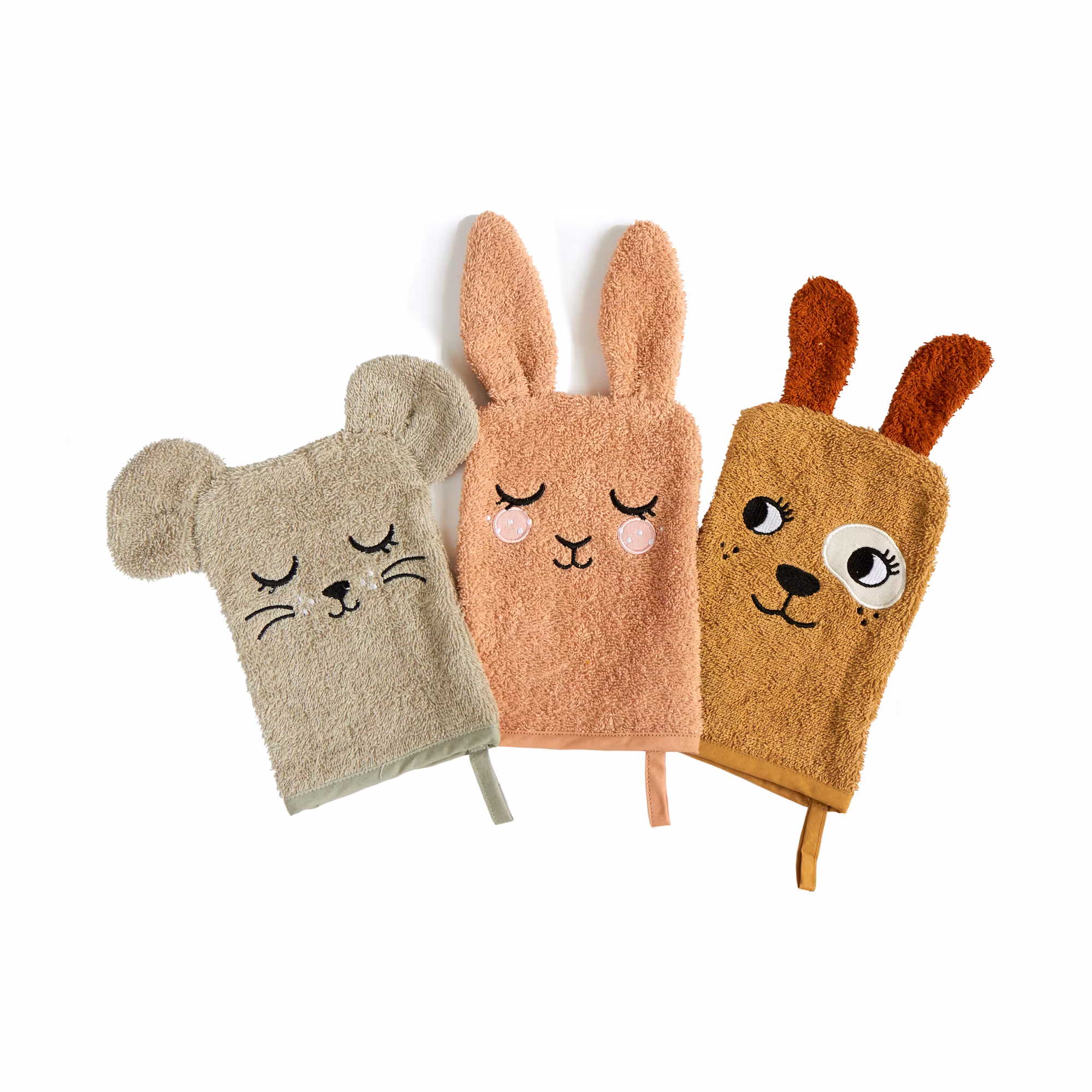 Ett set med tre söta tvätt-vantar med fastsydda öron och dekorerade som en kanin, en mus och en hund, vilket kan göra det roligare för små busungar att tvätta sig.