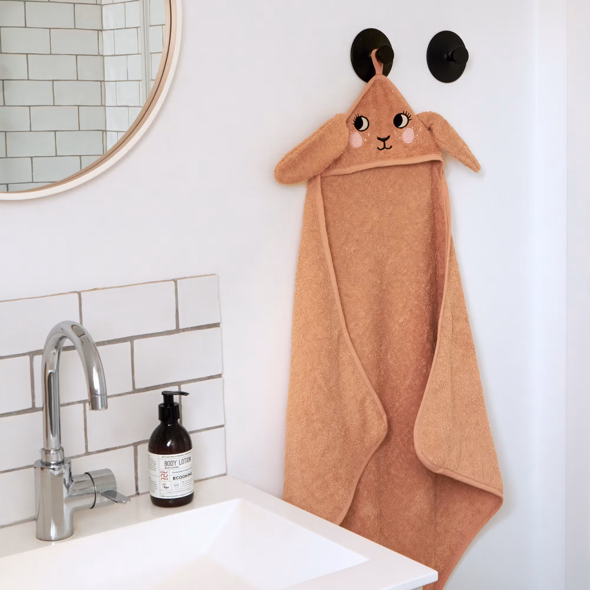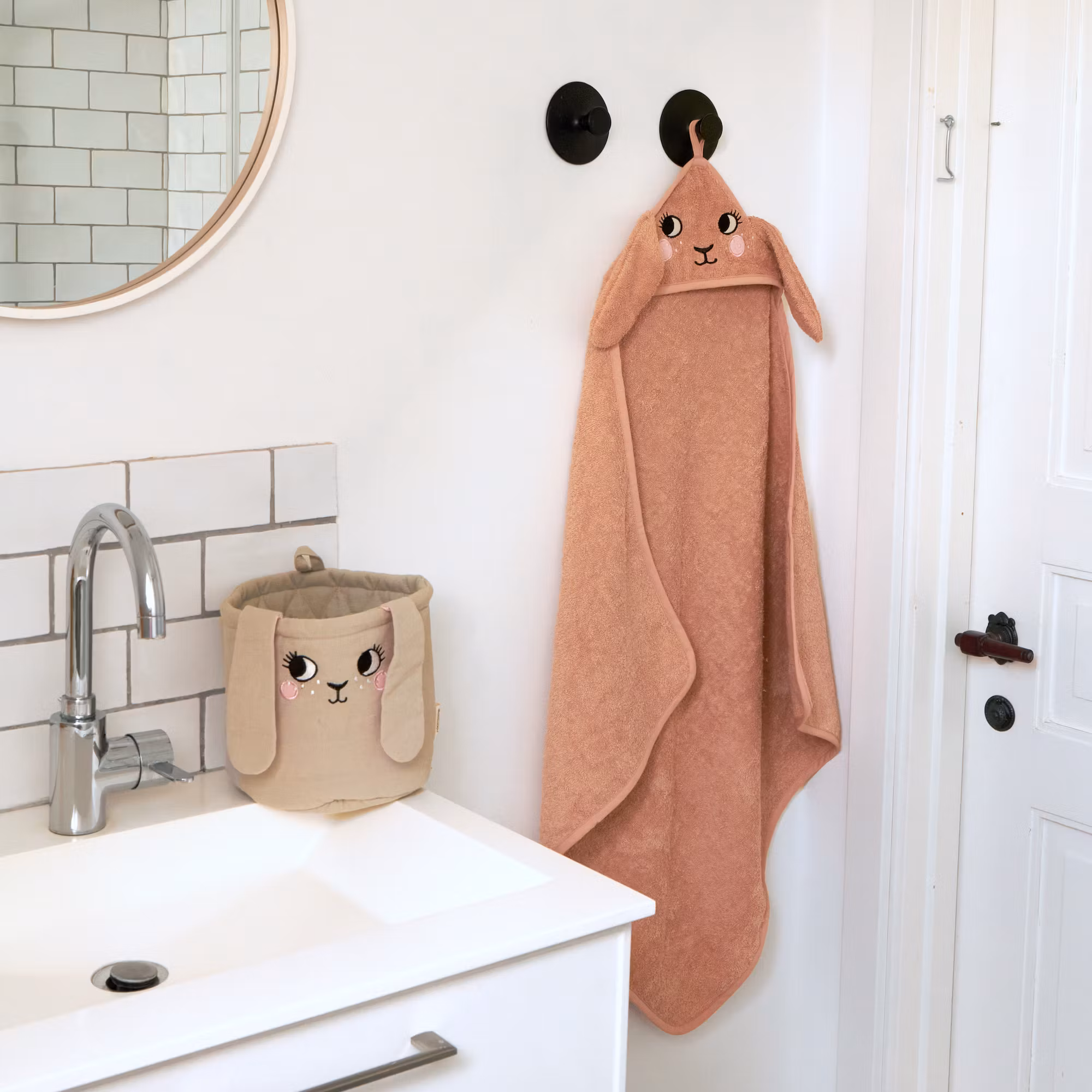 En ekologisk samt GOTS-certifierad gammelrosa badhandduk med huva i ena hörnet för de minsta, som är dekorerad som en kanin med långa öron fastsydda och broderade blundande ögon.