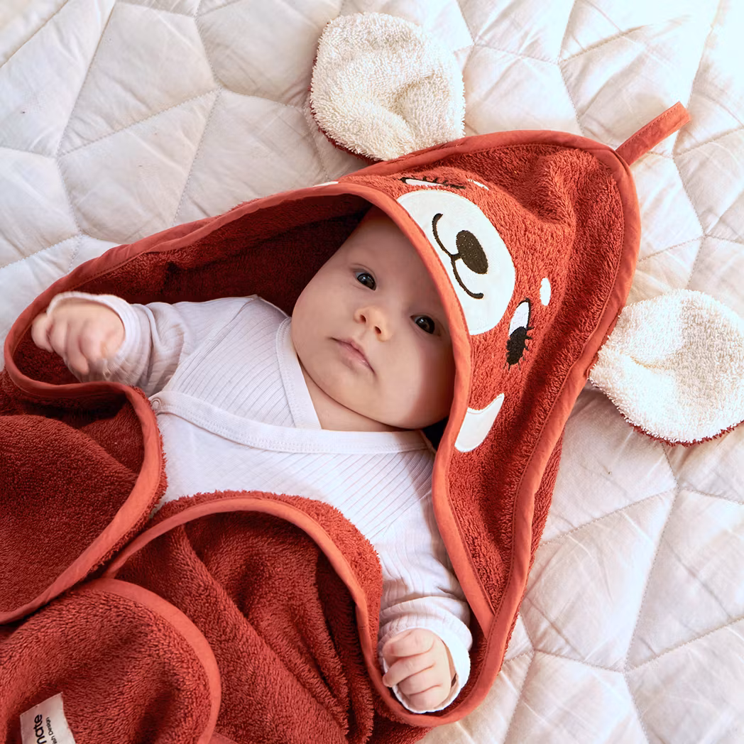 En ekologisk samt GOTS-certifierad mörkröd badhandduk för de minsta med en huva i ena hörnet och dekorerad som en röd panda med stora öron fastsydda, några applicerade vita fläckar och ett broderat ansikte.