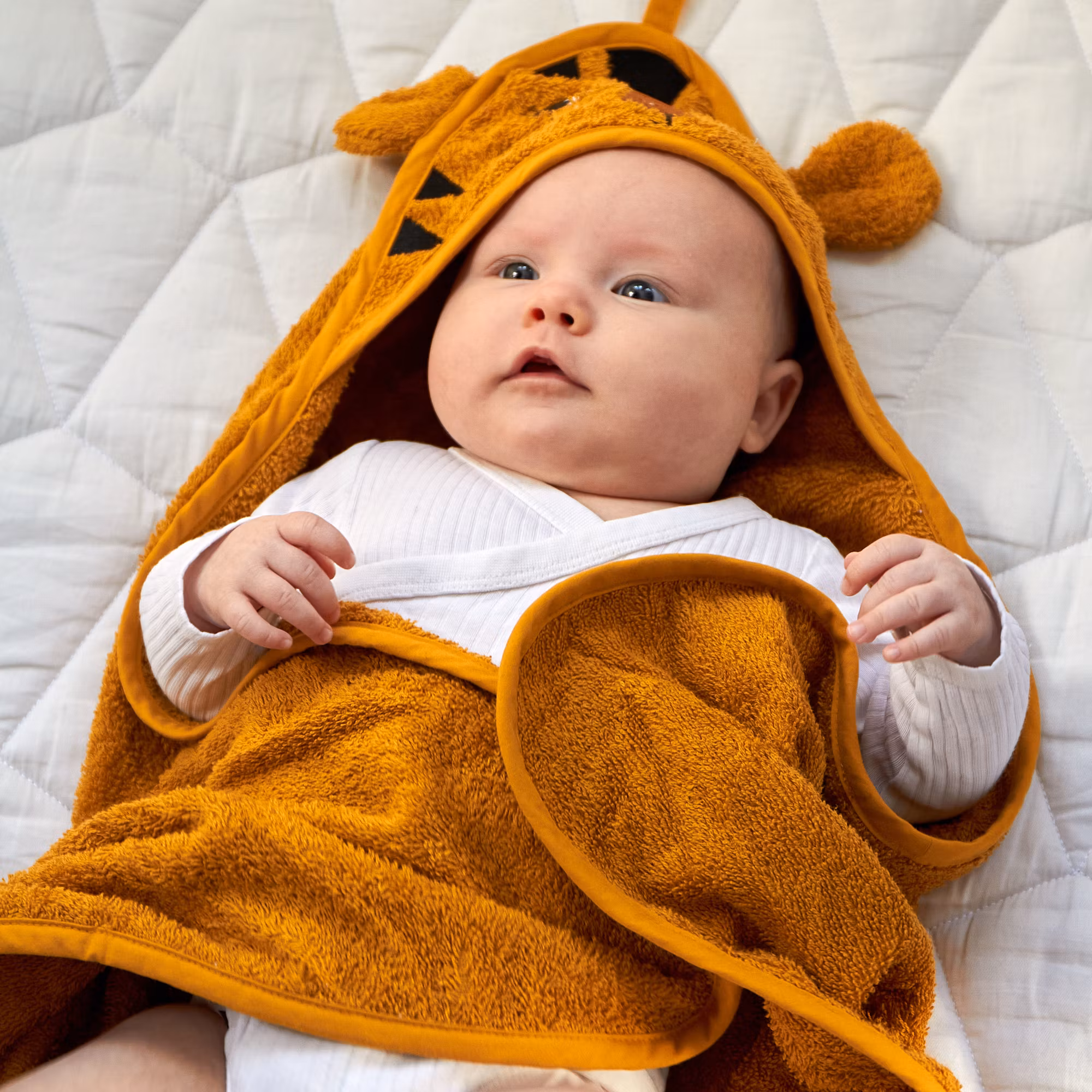 En ekologisk samt GOTS-certifierad ockra-gul badhandduk med huva i ena hörnet för de minsta och dekorerad som en tiger med runda små öron fastsydda och broderade blundande ögon.