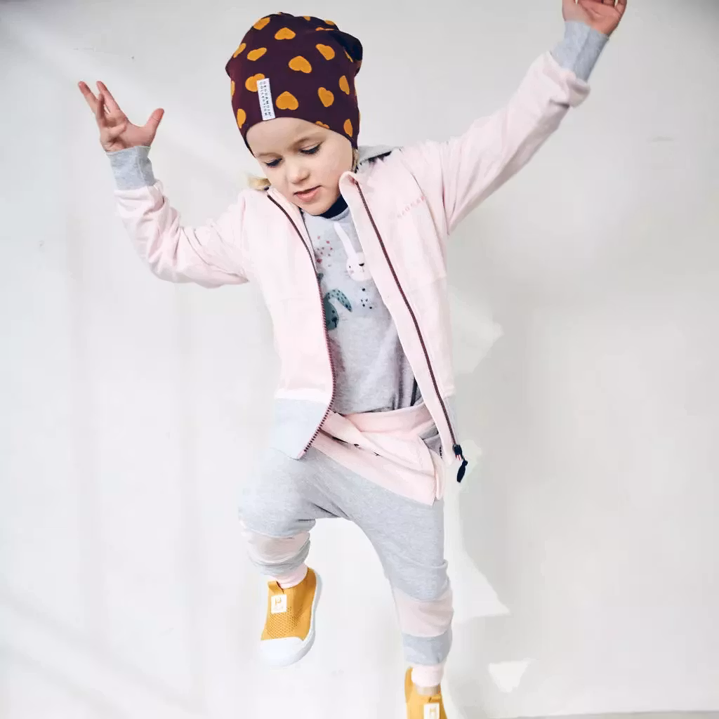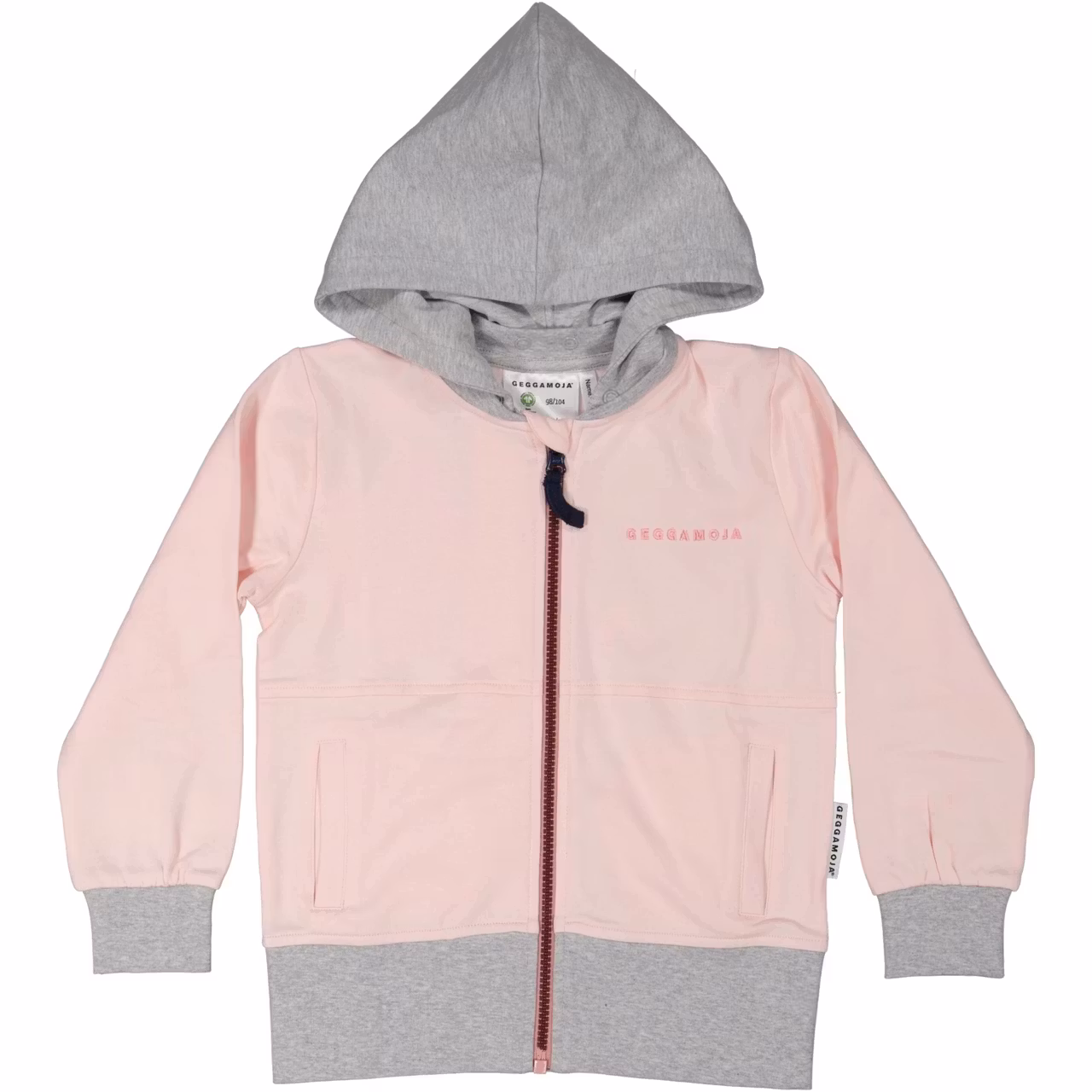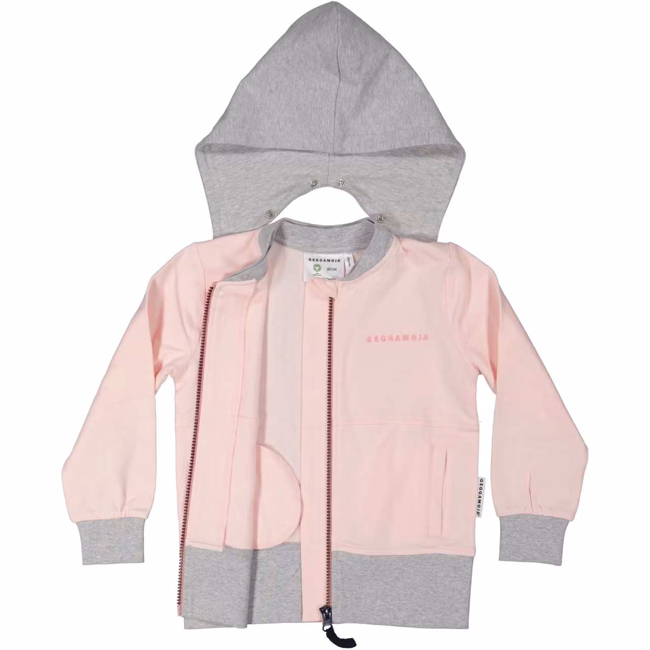Rosa och grå collegejacka med dragkedja fram. Luvan som är avtagbar och muddarna är grå.