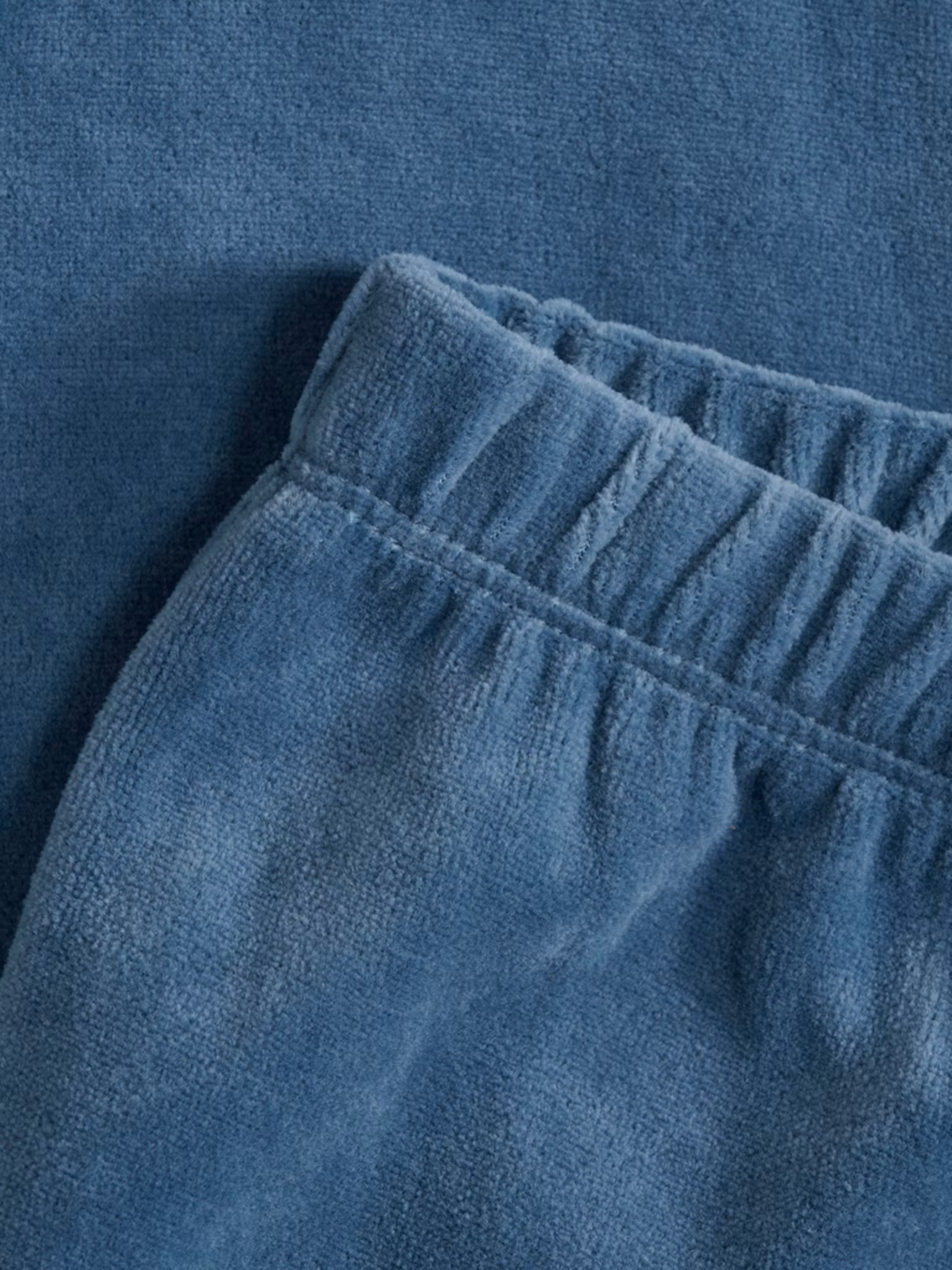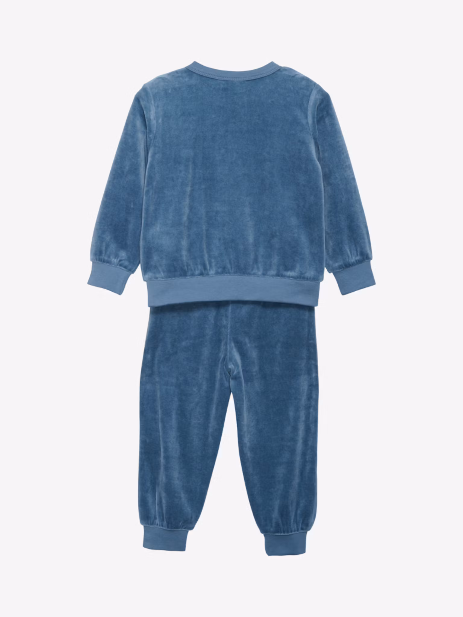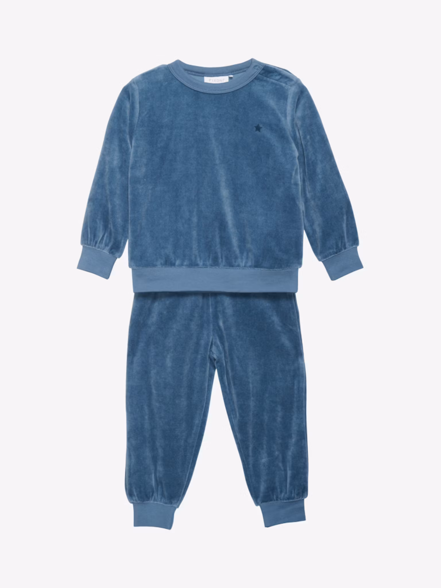 Setet har ribb vid fållen, handleder och vrister. Knappar vid axlarna och långa ärmar.