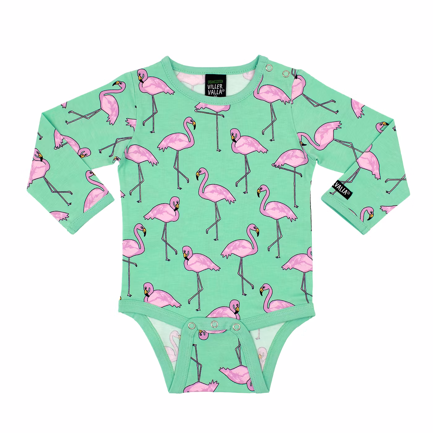 Mjuk långärmad trikåbody, med underbara flamingos.