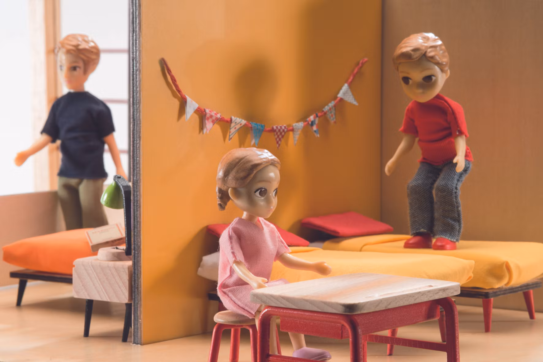 Ett läckert designat dockhus i modern stil. Med geometriska former och stora glaspartier och skarpa färger.