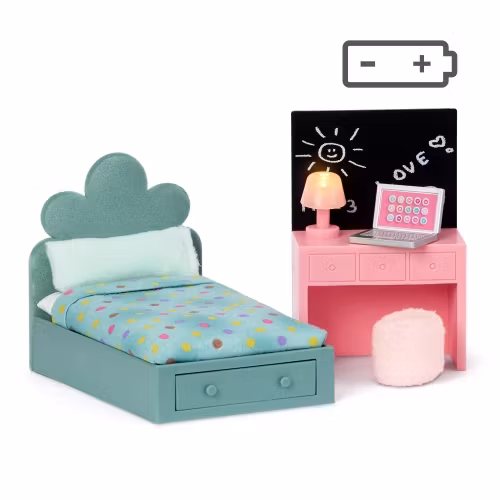 Tuff säng, pall och skrivbord till familjen Lundbys tonåringar. På skrivbordet står datorn redo att spela på eller chatta med kompisarna! När det mörknar tänder du självklart den lilla batteridrivna lampan för att få belysning i dockskåpet. Lampan släcks sedan per automatik efter 15 minuter. Sängen har en flossad sänggavel, utdragbar låda för förvaring och ett mjukt, mysigt täcke. Nu kan tonåringen njuta av långa sovmorgnar precis så ofta som du bestämmer! I setet ingår också en mjuk pall och en blackboardtavla. 1 batteri (CR2032) ingår. Lundbys fina dockhus har alla detaljer man kan önska sig; vackra tapeter från Sandberg Wallpaper och mängder med inredning & tillbehör. Vår dockhusbelysning är försedda med batteridrivna LED-lampor och inbyggd timer. Med Lundbys dockhusmoduler kan dockskåpet byggas ut och byggas på för att skapa din personliga värld av dockskåp. Lundby - svenskdesignade, populära dockhus i olika modeller. Barnet kan skapa sin egen värld med dockhusen, dockhusdockorna av olika etnicitet och med olika funktionsvarianter, de detaljerade dockhusmöblerna, belysningen och de andra dockhustillbehören till Lundby.
