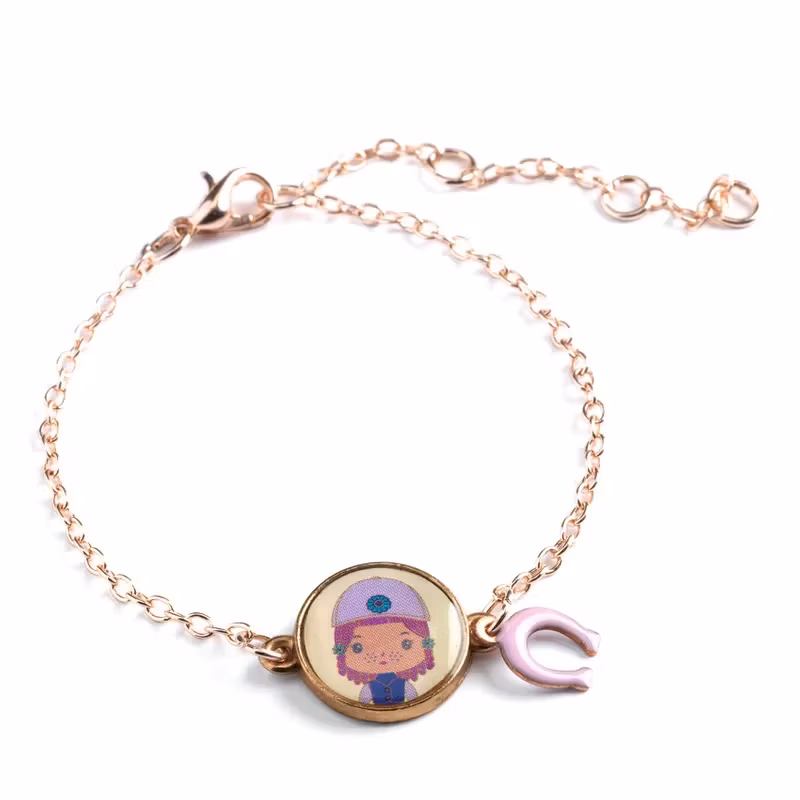 Ett snyggt armband med en guldpläterad kedja dekorerad med en bild på Tinyly figuren Joe i sin ridhjälm, samt en läcker berlock i form av en hästsko.