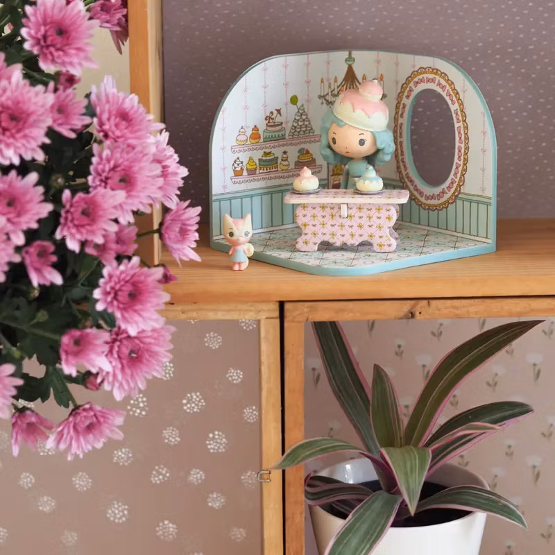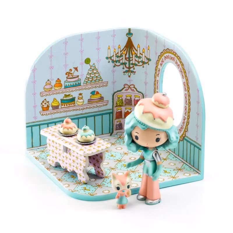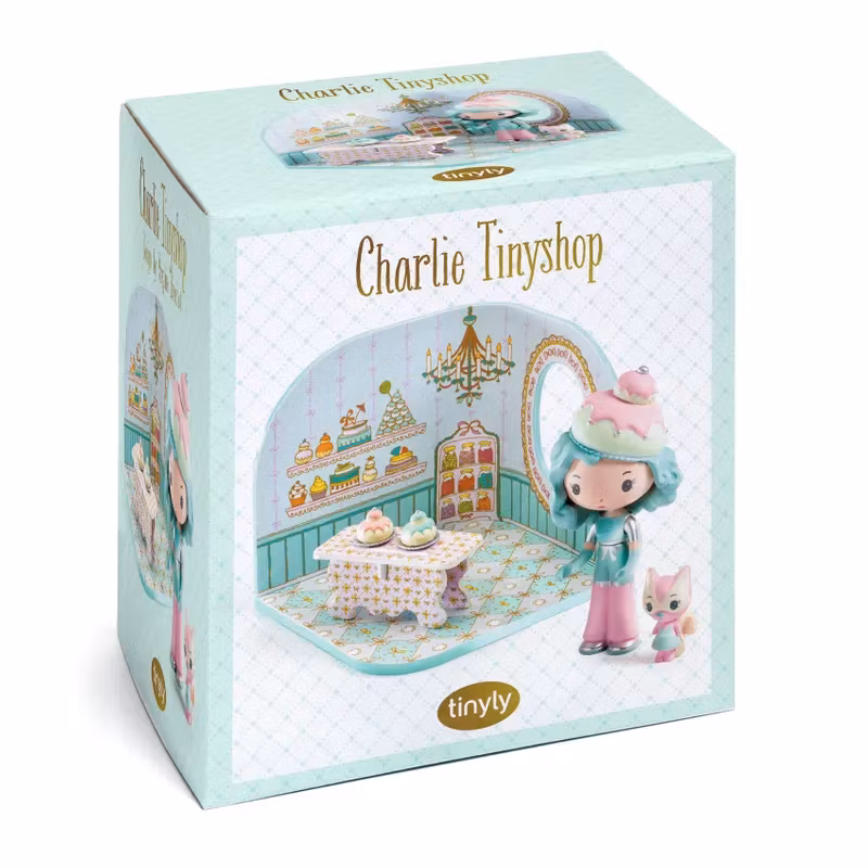 Detta eleganta och lockande lilla utrymme är fullt av charm, helt öppet för enklare åtkomst vid lekar och blir ett bra komplement till Tinylys portabla hus. Charlie är en söt tjej med ett skimrande torkost, lockigt hår, en rolig hatt i form av ett bakverk och en snygg rosa byxdress med ett turkost förkläde.