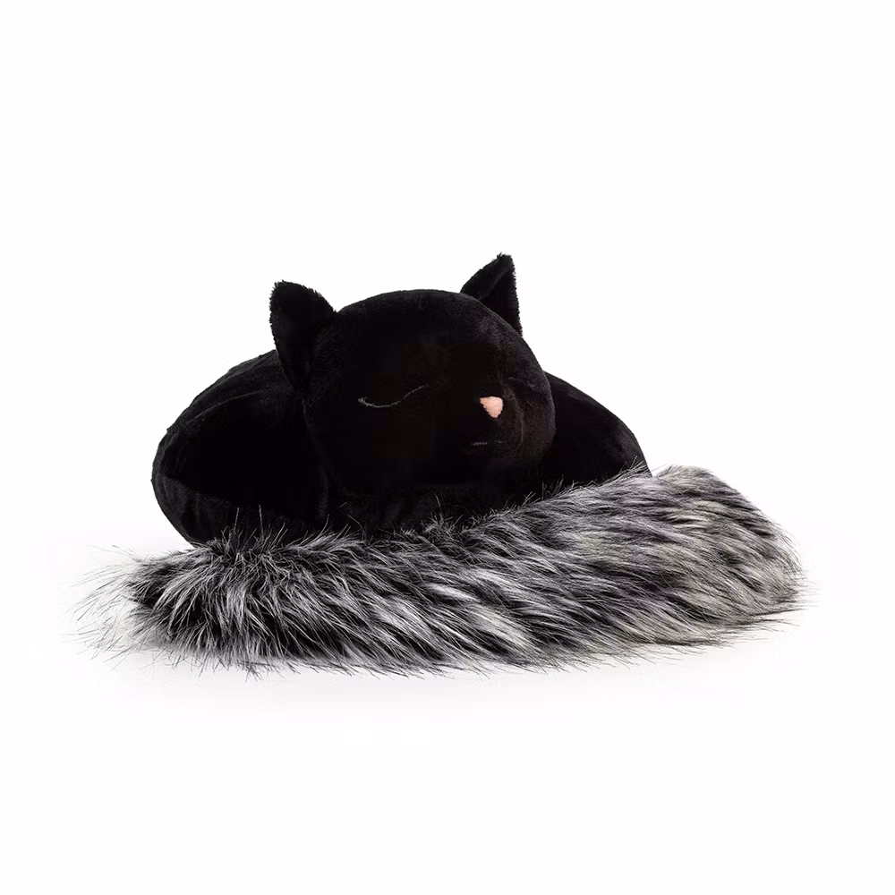 Denna kisse har förädlat konsten att ta riktigt mysiga tupplurar. Insvept i sin härligt fluffiga svart-vita svans ligger denna lilla katt och latar sig, slumrar till eller sover från soluppgång till solnedgång. Med djärvt kolsvart och sammetslen päls, broderade slutna ögon, små spetsiga öron och inringad av den fluffiga svansen är denna gosiga skönhet den perfekta kompisen att sova med eller på.
