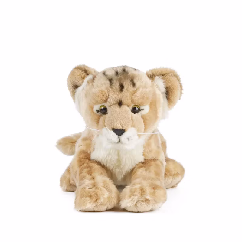En riktig raring med ett gulligt och charmigt ansikte, gyllene ögon med stora pupiller, svaga mönster i pälsen som ska kamouflera den lite när den leker, detaljer i fluffig gräddvit päls och en mjuk samt kramgo kropp.