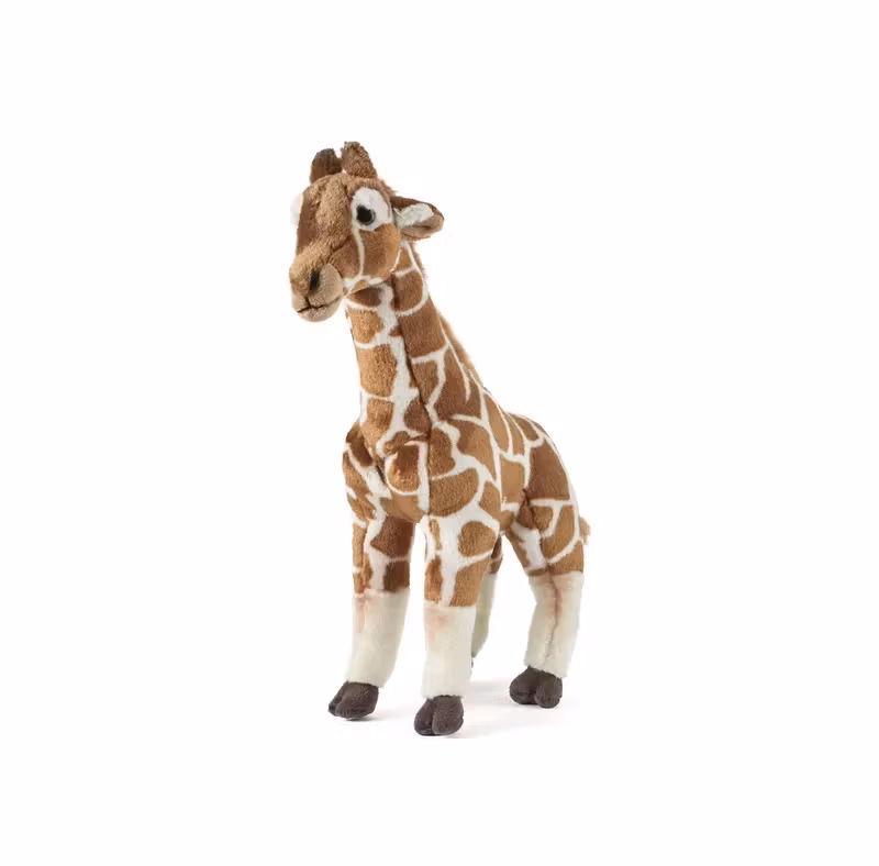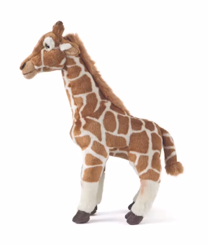 En stor och härligt naturtrogen giraff med en lång, elegant hals, långa fina ben, ett vackert mönster i pälsen och en charmig liten svans till det.