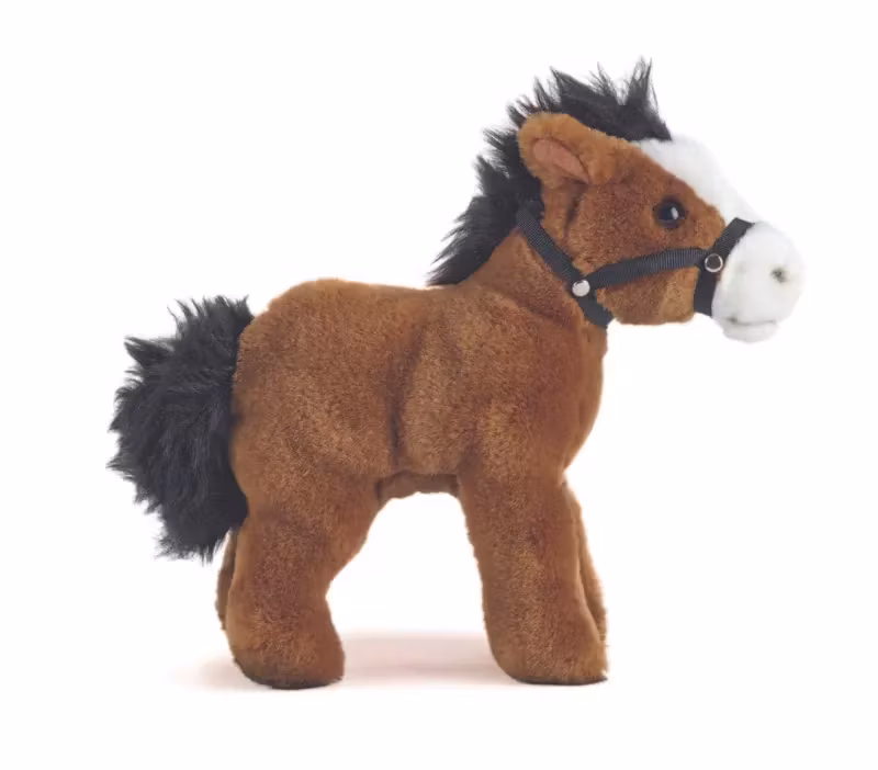 Tjusig ponny i rödbrunt med vit bläs och grimma. Naturtrogen i sitt utseende och varje hästtjejs och -killes dröm.