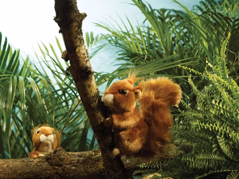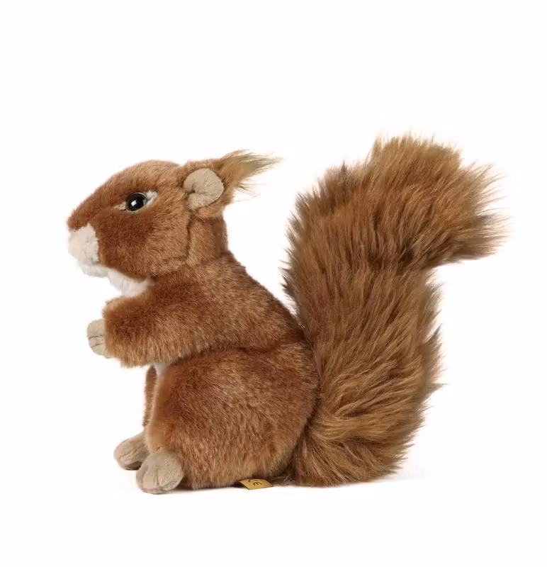 Denna bedårande ekorre har en gosig rödbrun päls med tassar i ljusbrunt och gräddvit mage samt små fluffiga tofsar på öronen.