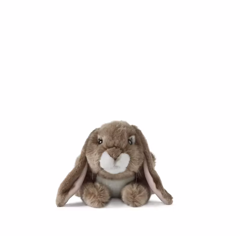 En härligt gosig och realistiskt utformad liggande kanin i mörkbrunt, med hängande öron och ett sött uttryck.