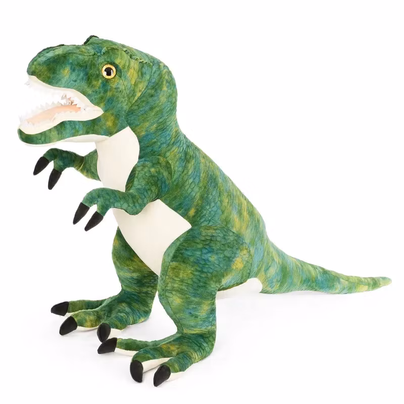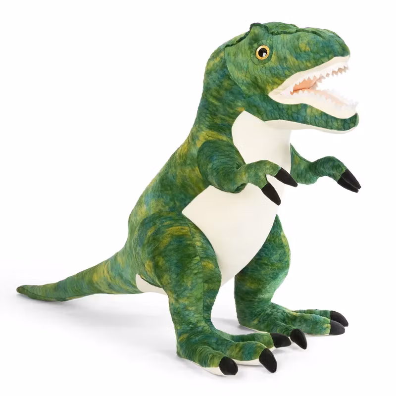 En gigantisk och gosig, men också vildsint Tyrannosaurus Rex med intensiva ögon, en aningen fjällig struktur på det lena, grönflammiga tyget och många härliga detaljer.