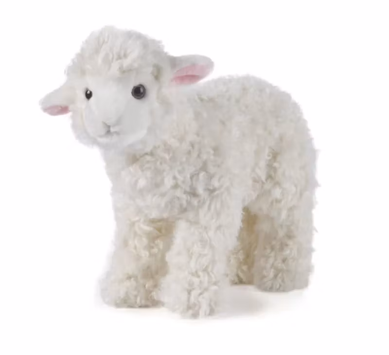 Härligt lamm i mjuk och gosigt vitt med fina detaljer som t ex rosa/hudfärg i öronen, näpen liten svans och pigga mörka ögon fulla med bus.