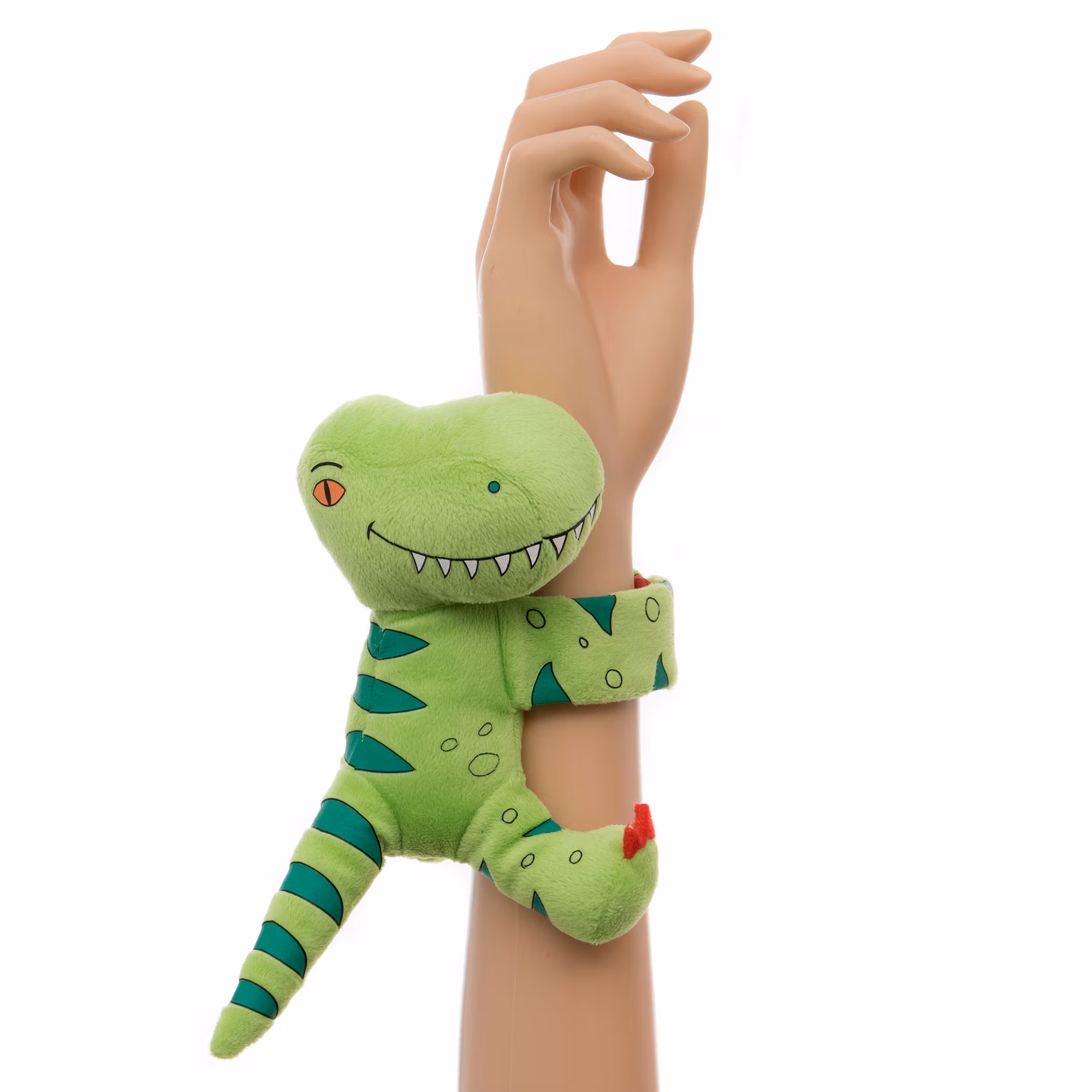 Fäst denna häftiga mjuka plyschdinosaurie i form av en T-Rex runt handleden med hjälp av dess armar som består av snap-armand, eller skapa en kedja av Wristipals vänner genom att sätta ihop dem med varandra.