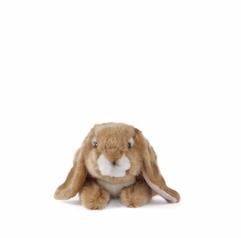 En härligt gosig och realistiskt utformad liggande kanin i en varm brun nyans, med hängande öron och ett sött uttryck.