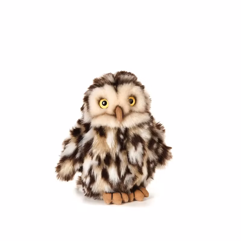 Denna söta lilla uggla har guldgula ögon och är vackert tecknad i vita, beige och olika bruna nyanser.