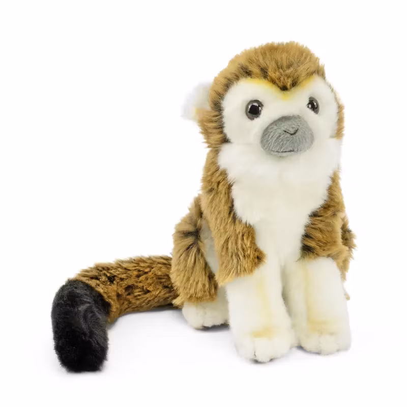 En gosig, helt bedårande och naturtroget utformad sittande ekorrapa eller dödskalleapa med mjuk päls i flera färger och en lång svans som är lite längre än kroppen.