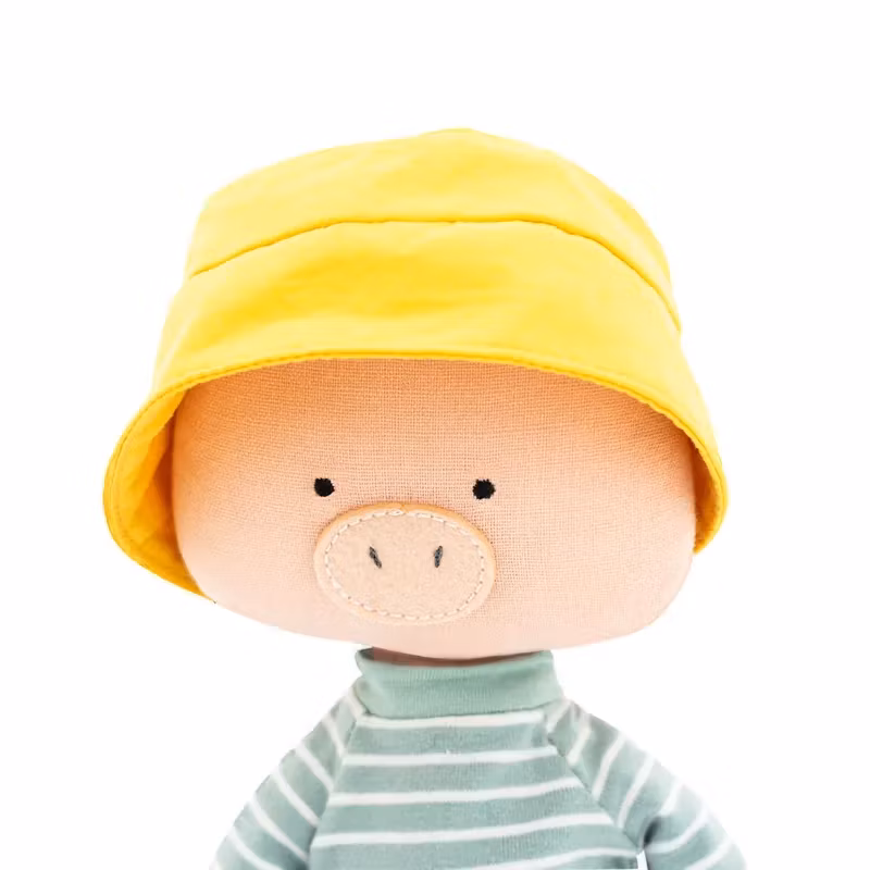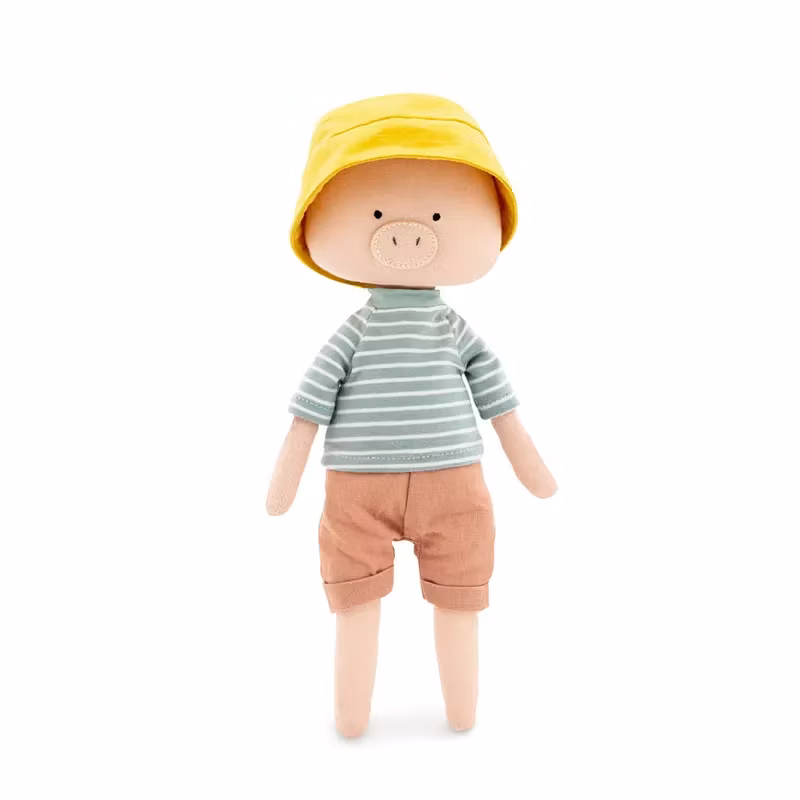 En bedårande söt och charmigt enkel docka i form av en gris, klädd i en randig tröja, shorts och en solhatt.