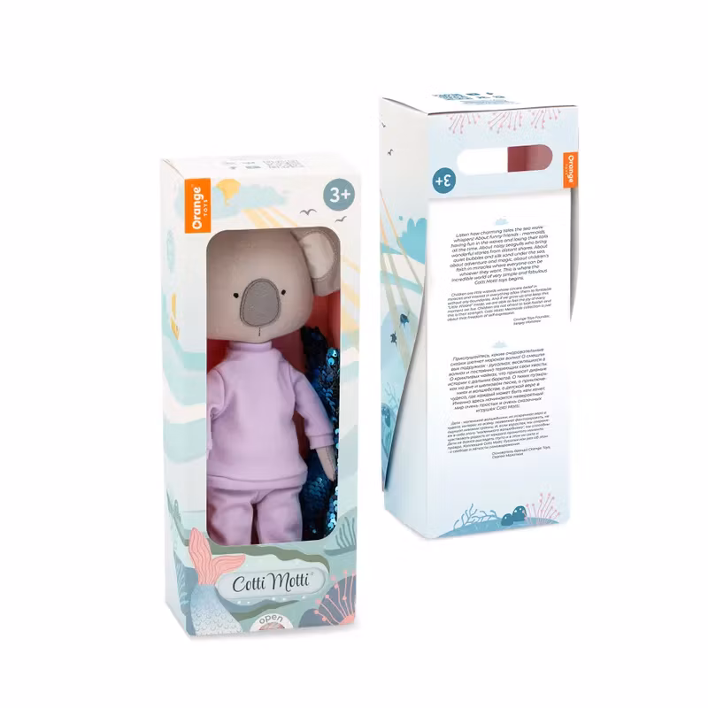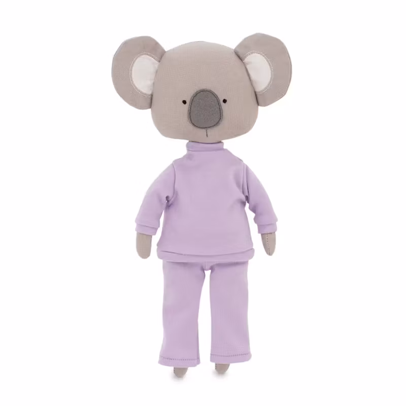 En mjuk docka med en charmigt enkel design, i form av en beige koala klädd i en lila joggingdress som består av en långärmad tröja med ficka på magen och ett par byxor. I paketet ingår dessutom en gåva i form av en fantastisk rosa stjärtfena så att dockan kan förvandlas till en sjöjungfru!