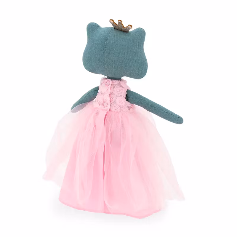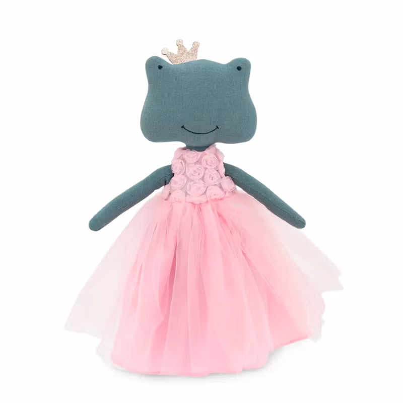 En mjuk docka med en charmigt enkel design, i form av en bedårande söt groda med en liten krona, klädd i en elegant ärmlös klänning med små rosor på överdelen och ett lager veckad organza över den långa, vackert skimrande kjolen.