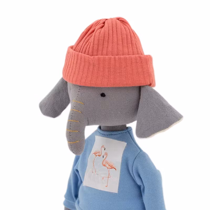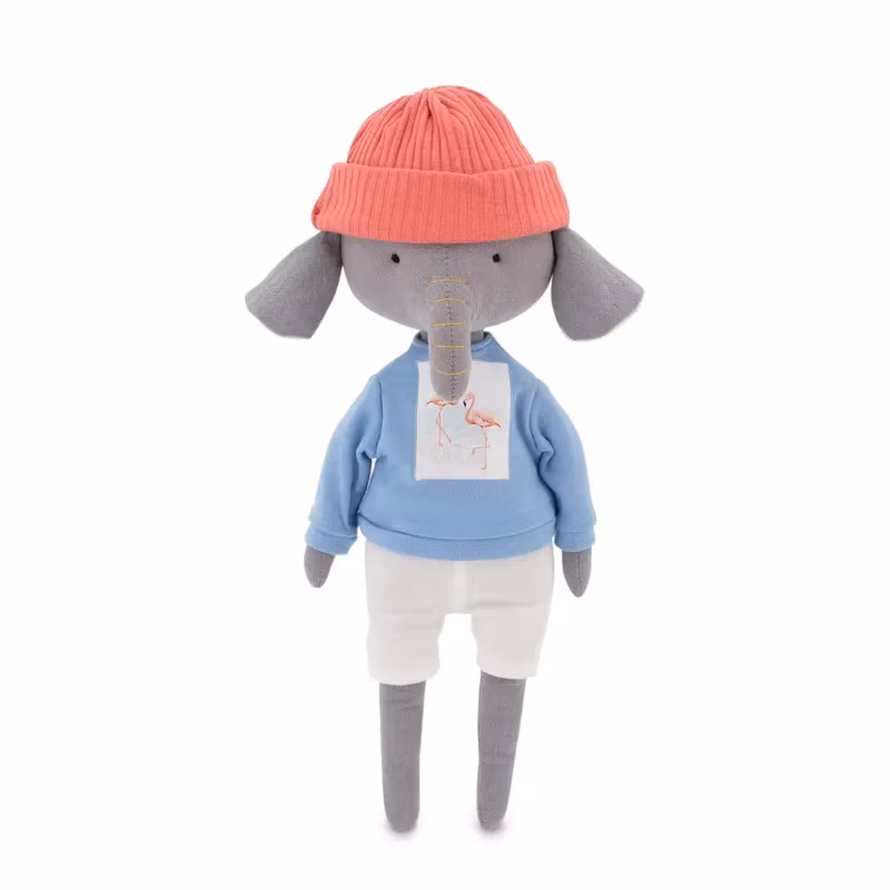 En mjuk docka med en charmigt enkel design, i form av en bedårande grå elefant, klädd i en mjuk blå sweatshirt med en bild av flamingos på bröstet, ett par shorts samt en tunn stickad mössa.