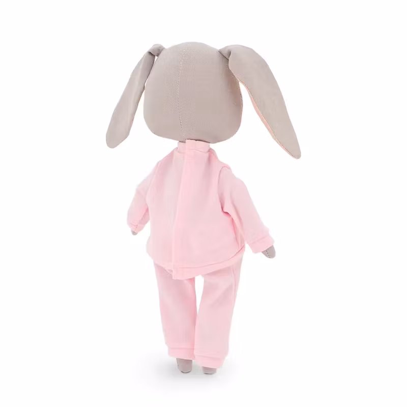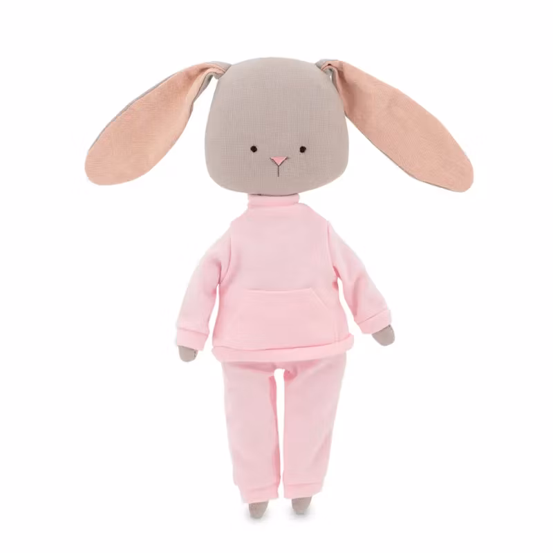 En mjuk docka med en charmigt enkel design, i form av en bedårande ljusgrå kanin, klädd i en rosa joggingdress som består av en långärmad tröja med ficka på magen och ett par byxor.