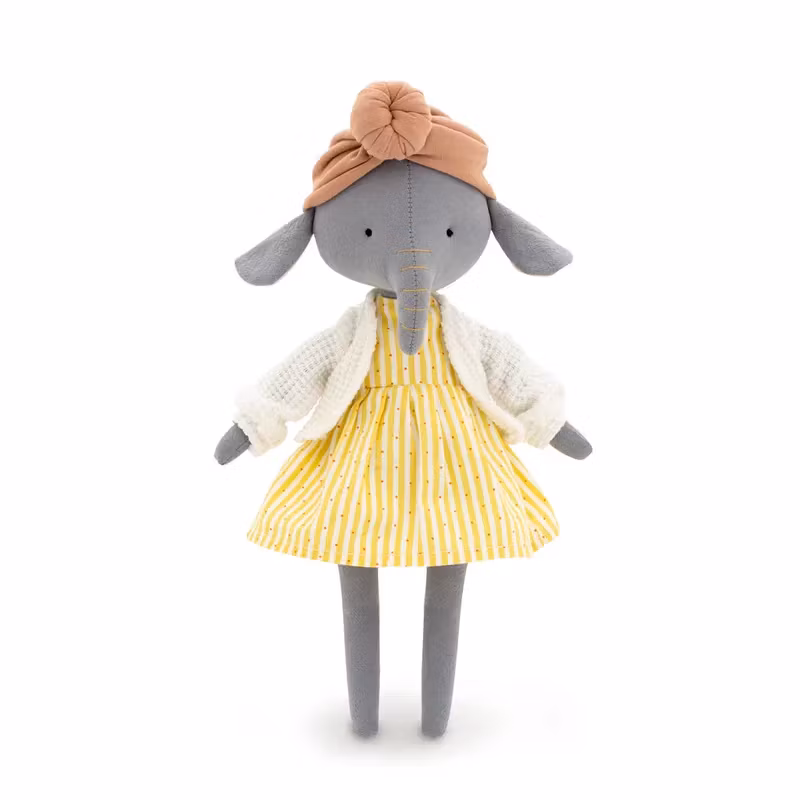 En bedårande söt och charmigt enkel docka i form av en grå elefant, klädd i en stickad kofta, en vacker ärmlös klänning samt en turban med en dekorativ knut fram.