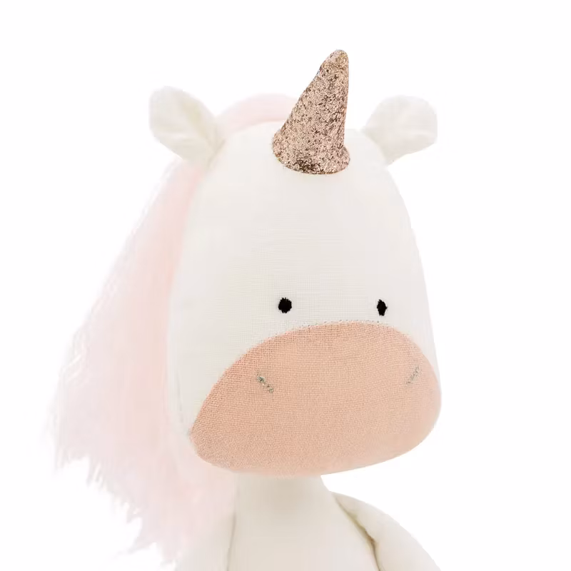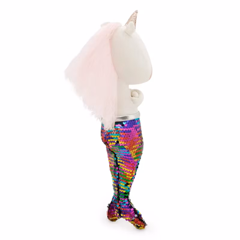 En mjuk docka med en charmigt enkel design, i form av en vit enhörning med ljusrosa man och ett glittrande horn, klädd i en fantastisk regnbågsfärgad stjärtfena så att dockan ser ut som en sjöjungfru.