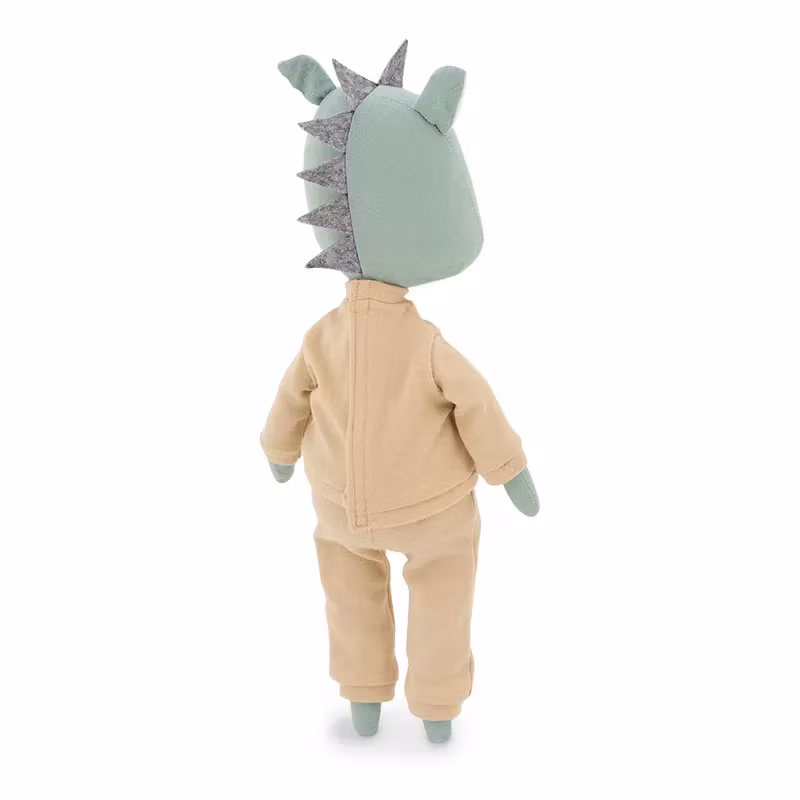 En mjuk docka med en charmigt enkel design, i form av en snygg ljusgrön drake med en frisyr av ljusgrå taggar, klädd i en beige joggingdress som består av en långärmad tröja med ficka på magen och ett par byxor.