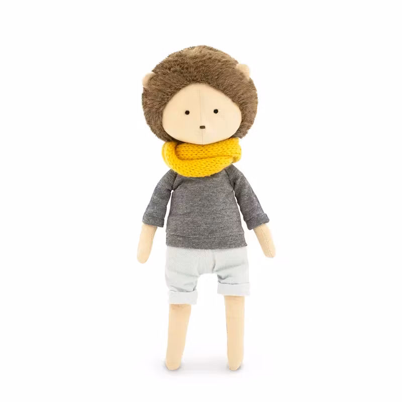 En bedårande söt och charmigt enkel docka i form av en igelkott med en mjuk och fluffig brun frisyr, klädd i en melerad tröja med trekvartsärm, shorts och en stickad halsduk.