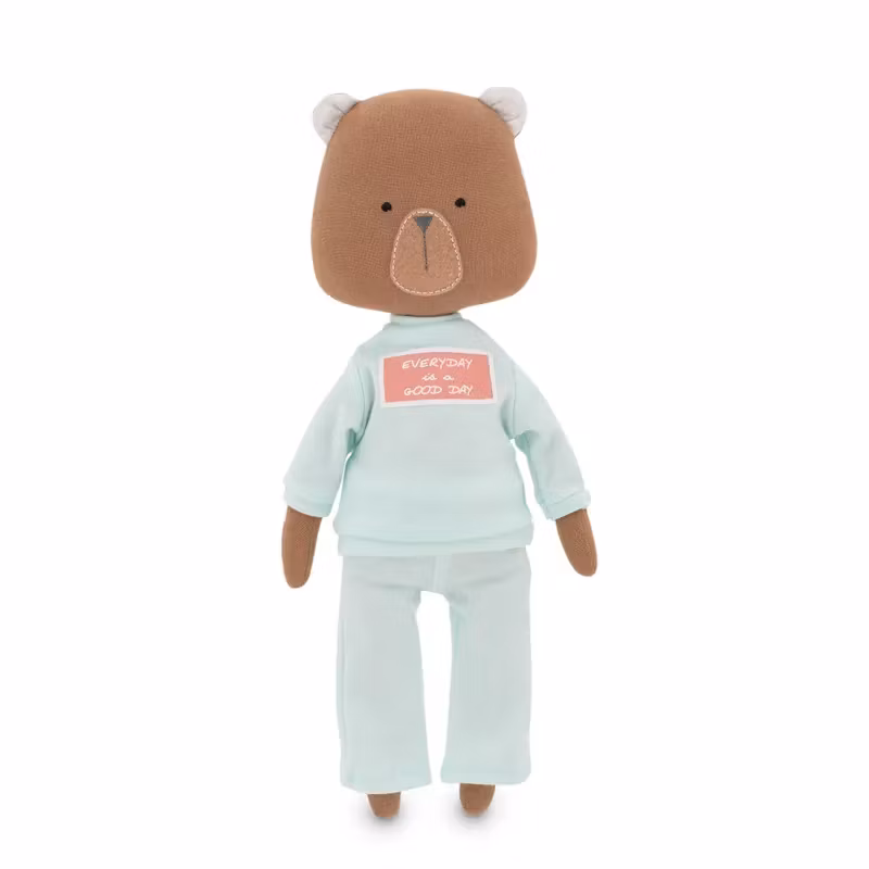 En mjuk docka med en charmigt enkel design, i form av en bedårande brun nalle, klädd i en rosa joggingdress som består av en långärmad tröja med texten "Everyday is a good day" på framsidan och ett par mjuka byxor.