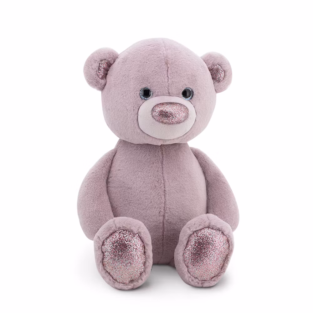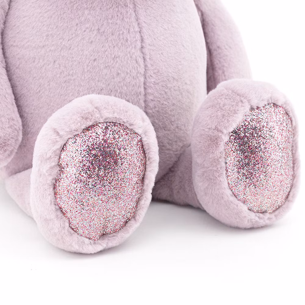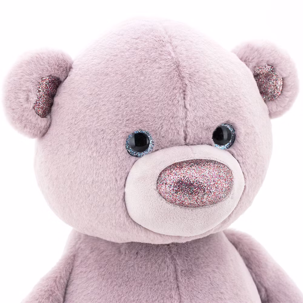 En charmig och oerhört gosig liten nalle i nyanser av lila, prydd med förtrollande glittriga accenter i ögonen, öronen, på nosen och på fotsulorna.