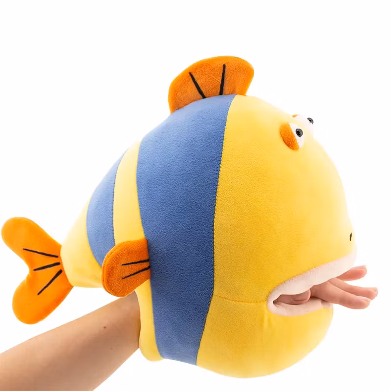 Dessutom har den en speciell ficka på magen som leder till fiskens mun, där du kan sticka in handen eller armen för att leka att den simmar. Krama en del av havet!