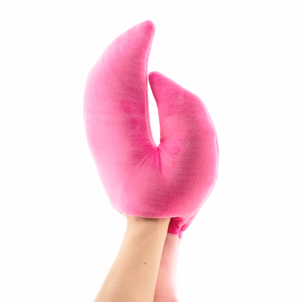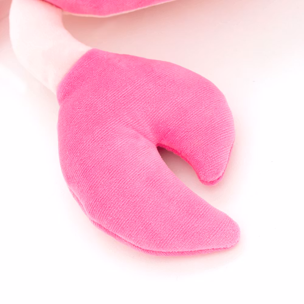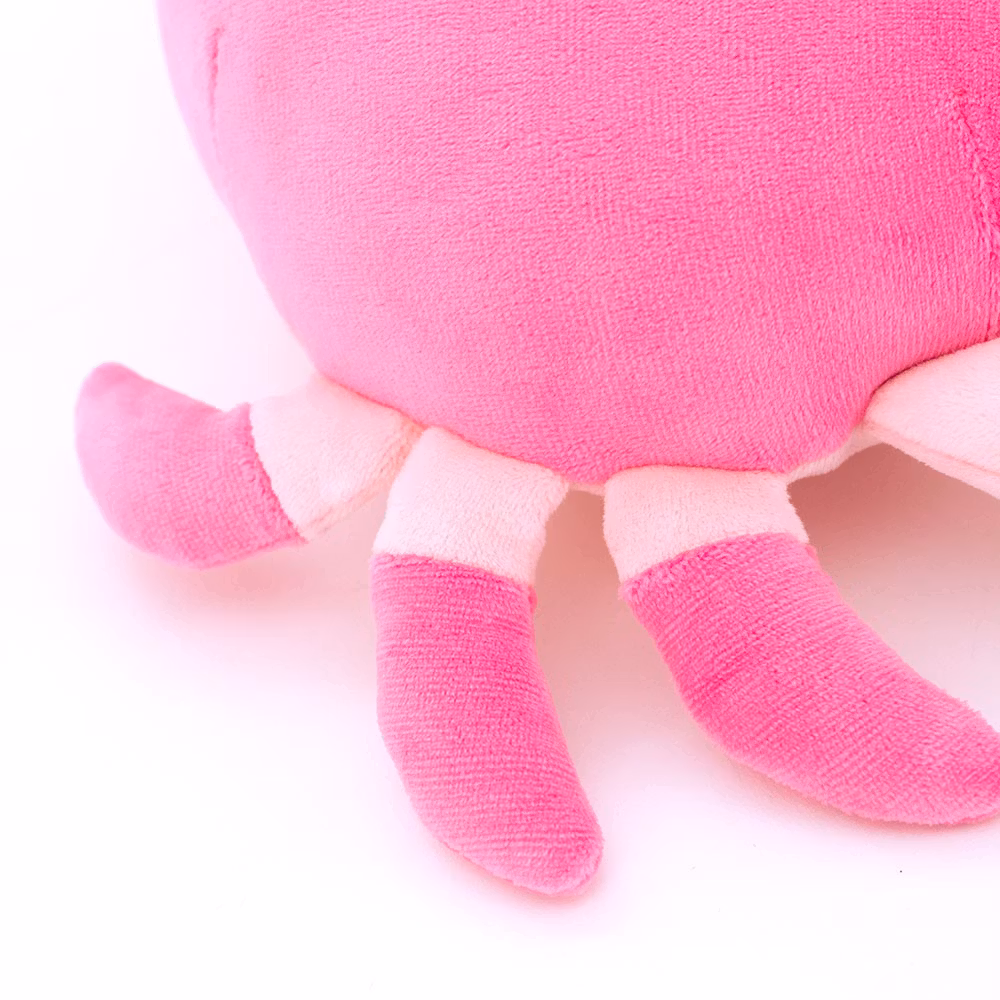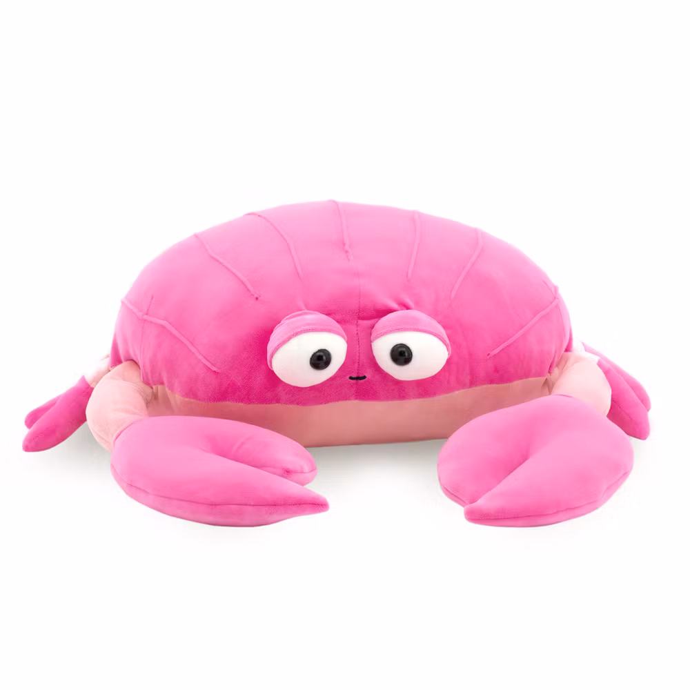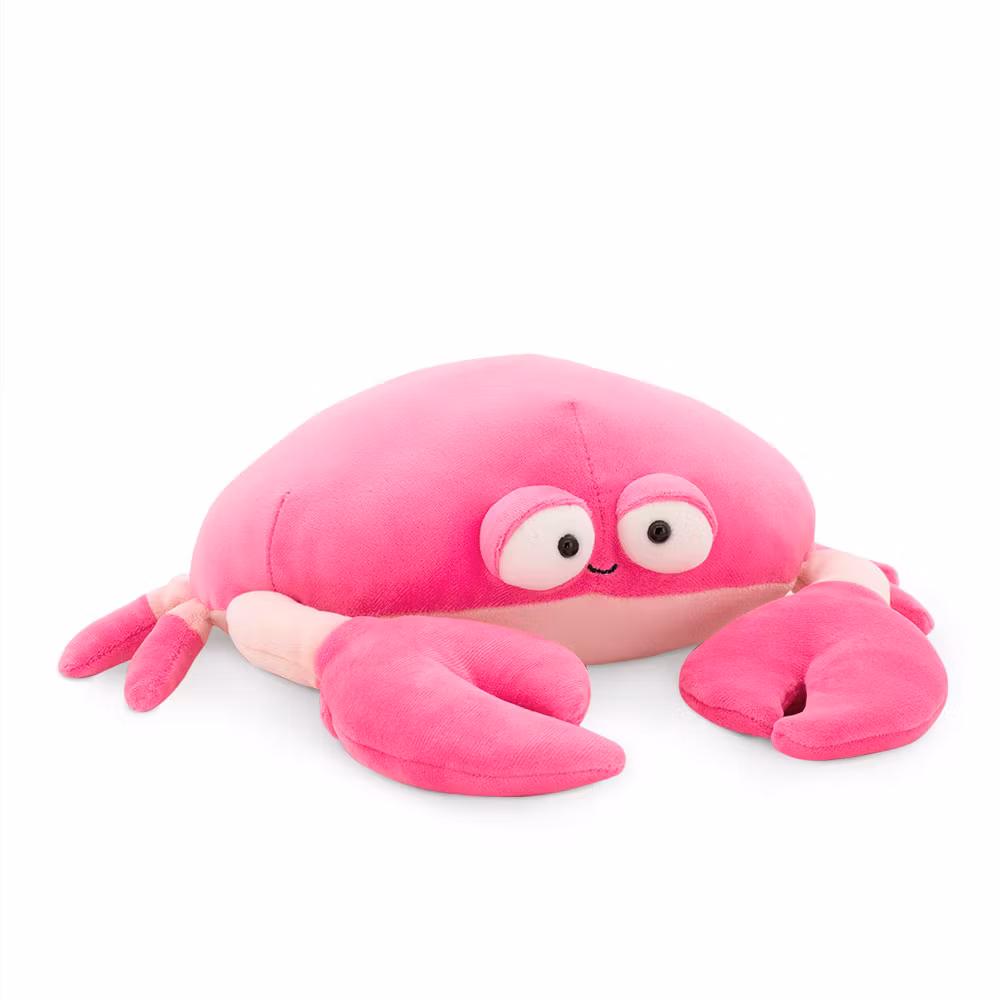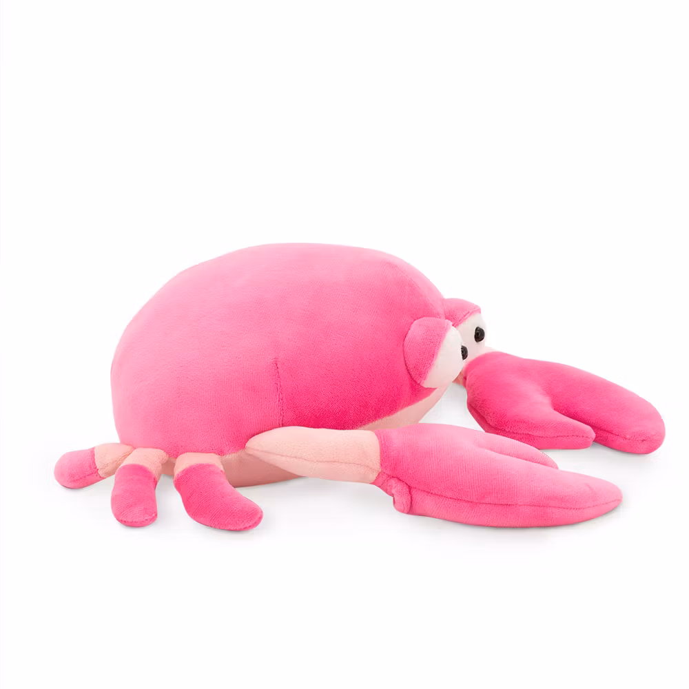 En cool och charmig krabba i ett lite större format, med mörkrosa skal och ljusare mage. Denna krabba har ett vänligt uttryck med lite utstående ögon samt ett glatt litet leende och en härligt gosig kropp som inbjuder till kramar och lek. Dessutom har den speciella små fickor i klorna där du kan sticka in händerna för att styra dem när du leker. Som att krama en del av havet! Tillverkad i ett super-mjukt stretchtyg av 100% polyester och fylld med en speciell polyester fiber som ger maximal mjukhet, med hög kvalitet i både material och säkerhet. Kan handtvättas och hängtorkas vid behov för att hålla den fräsch.