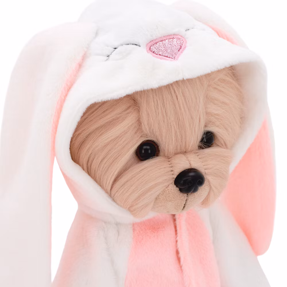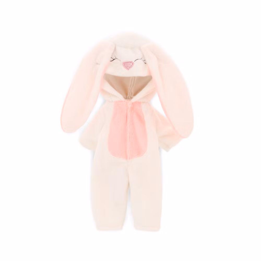 En mjuk och gosig jumpsuit i vitt och rosa, prydd med bedårande detaljer på huvan - en glittrande rosa nos, långa hängande kaninöron och ett broderi i form av blundande ögon med ögonfransar.