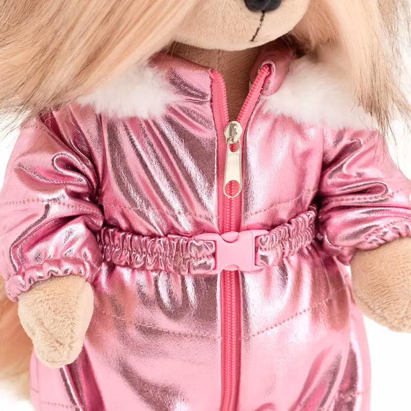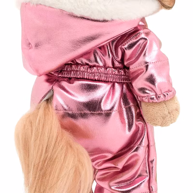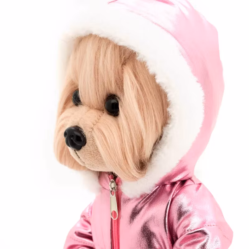 En snygg gyllenbrun yorkshireterrier med lång päls på huvud och svans som du kan kamma och sätta upp i frisyrer. Klädd i en lyxigt blänkande rosa vinter overall med fluffiga vita detaljer på huvan och fluffiga vita stövlar med blänkande rosa sula. Kläderna och skorna är avtagbara och passar alla hundar i serien.