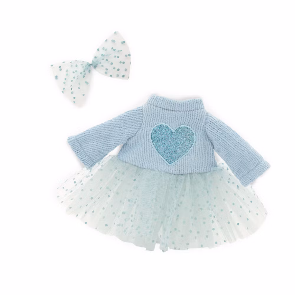 Ett sött set bestående av en snygg klänning med en veckad kjol av småprickig organza i ljusblått och en stickad överdel i ljusblått med långa ärmar som passar för kyliga dagar, dekorerad med ett stort glittrigt hjärta, tillsammans med en matchande hårdekoration i form av en söt rosett i ljusblå organza som gör setet komplett. Klänningen stängs med ett kardborrband i ryggen för enkel på- och avklädning.