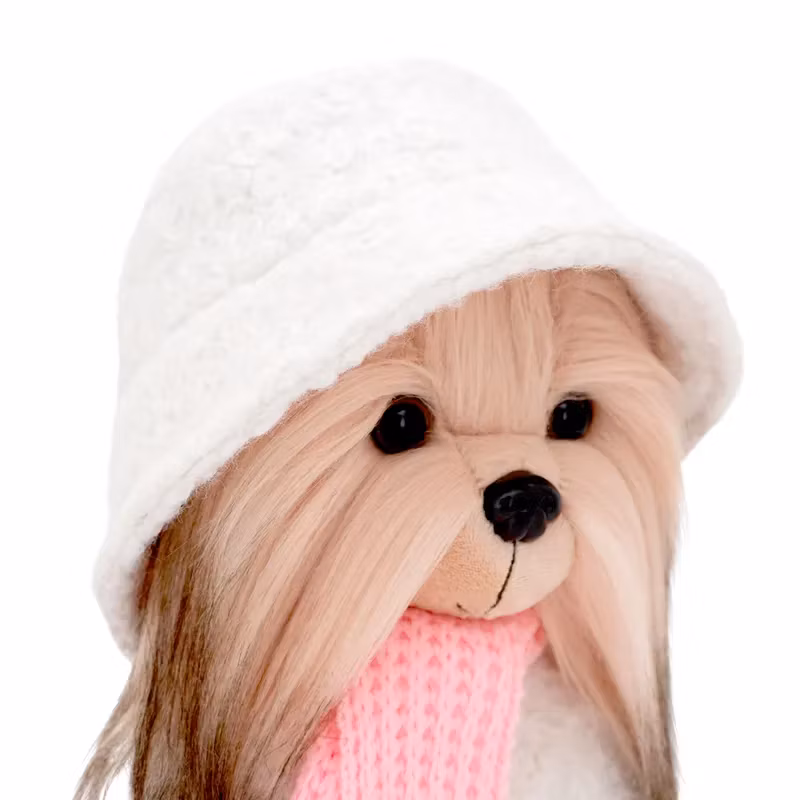 Ett trendigt set för kallare väder, bestående av en lång vit jacka med ullig struktur, små rosa knappar och fickor framtill, en matchande hatt som håller huvudet varmt, en lång stickad halsduk i varmt rosa och ett par snygga höga kängor i rosa med snörning. Kappan stängs med kardborrband för enkel på- och avklädning. Varje plagg i serien är designat med omsorg för att passa perfekt på alla Lucky Doggy-hundar, så det är bara att välja de du gillar bäst.