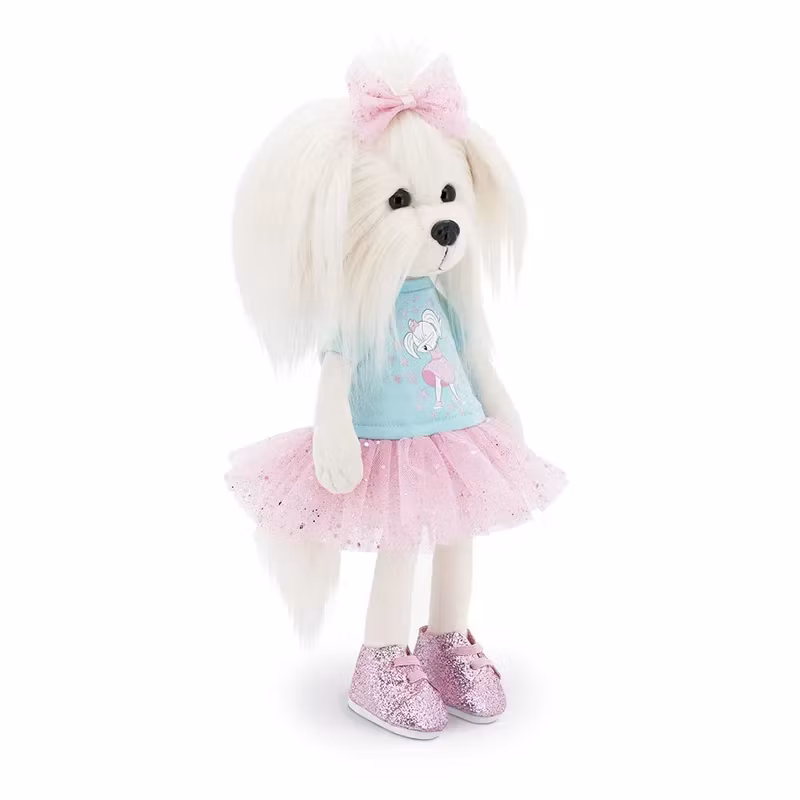 Ett glittrande set med söta kläder, bestående av en snygg klänning med en ljusblå överdel med ett coolt motiv av en dansande vit malteser hund samt en veckad tyllkjol översållad med små paljetter, glittriga rosa skor med gummiband till snören och en hårdekoration med en söt rosa rosett i matchande rosa tyll som gör setet komplett.