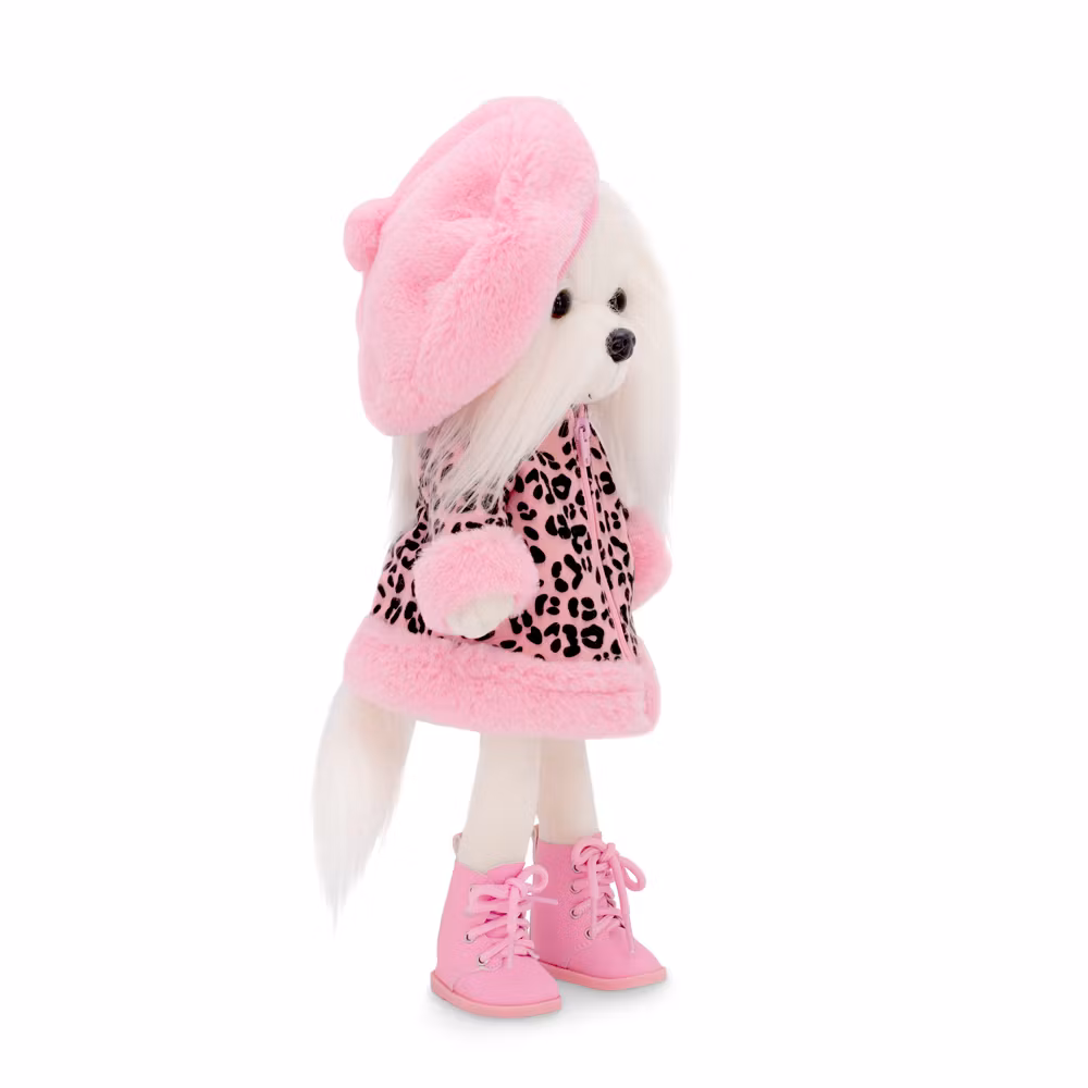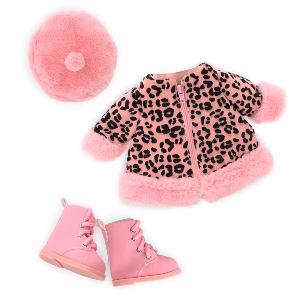 Ett snyggt rosa set med ytterkläder för den kallare delen på året, bestående av en leopardmönstrad jacka med fluffiga kanter i velour, en generös basker i velour för att hålla huvudet varmt och ett par höga kängor med snörning. Jackan stängs med ett blixtlås för enkel av- och påklädning.