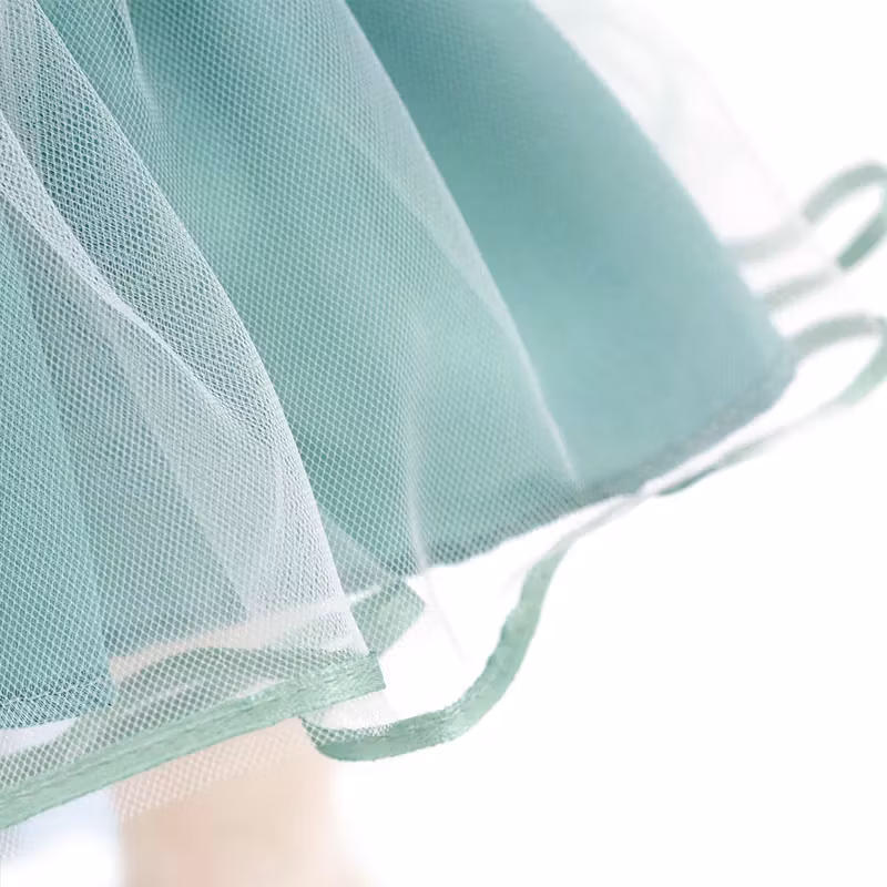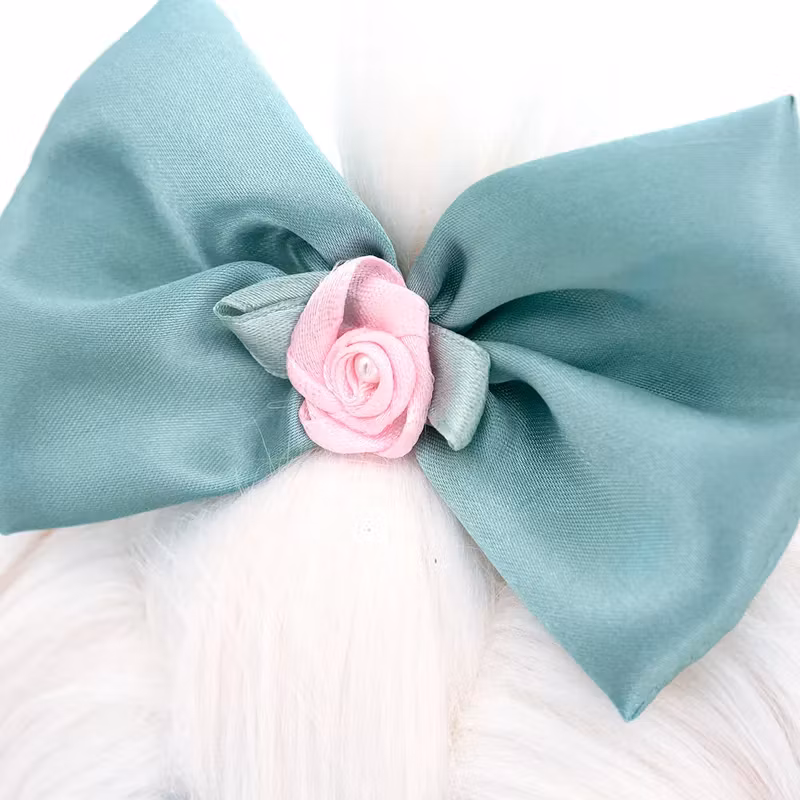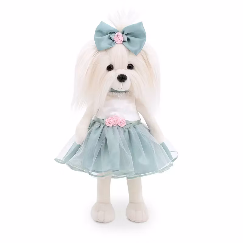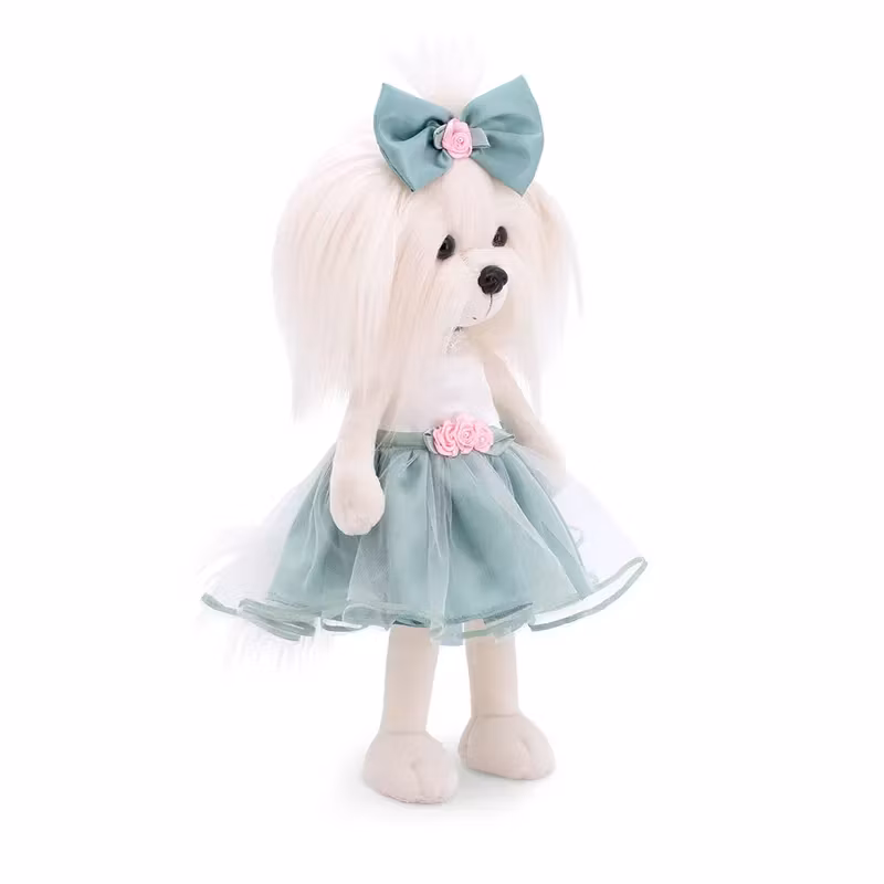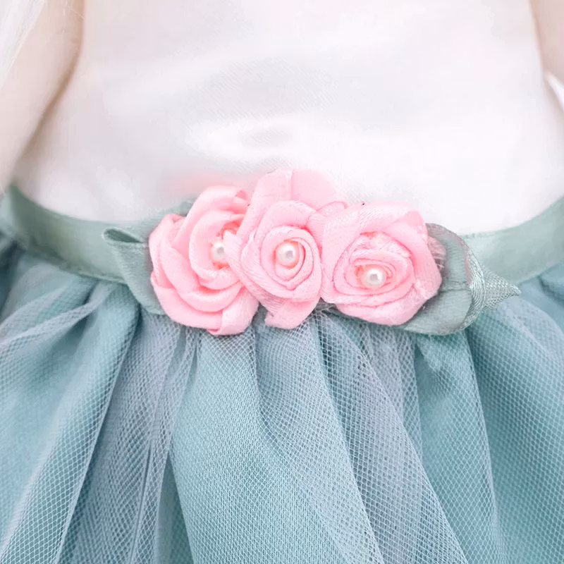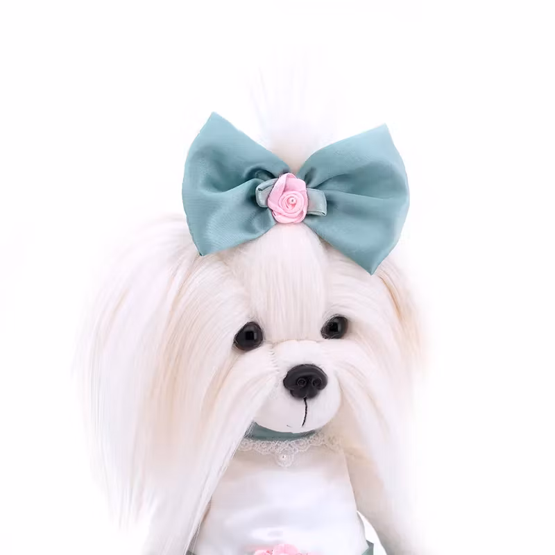 Hunden är klädd i en elegant ärmlös klänning i skimrande nyanser av blekgrönt. Ett band i midjan pryds av tre små rosa rosor med varsin liten pärla i mitten, vilket skapar en vacker fokuspunkt, medan en intrikat spets följer halsringningen och ett lager lätt organza nästan svävar över den vackert skimrande kjolen. För att fullända utstyrseln ingår en matchande hårdekoration i form av en stor rosett med en utsökt rosa ros i mitten. Klänningen stängs med ett smidigt kardborrband i ryggen för enkel av- och påklädning och det finns en praktisk öppning för hundens svans. Alla kläder är avtagbara och passar på alla hundar i serien.